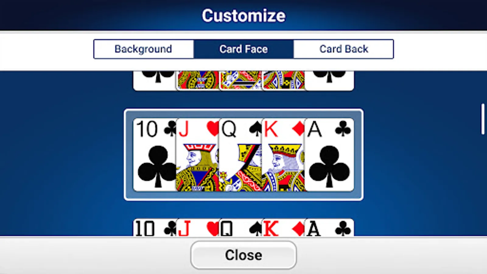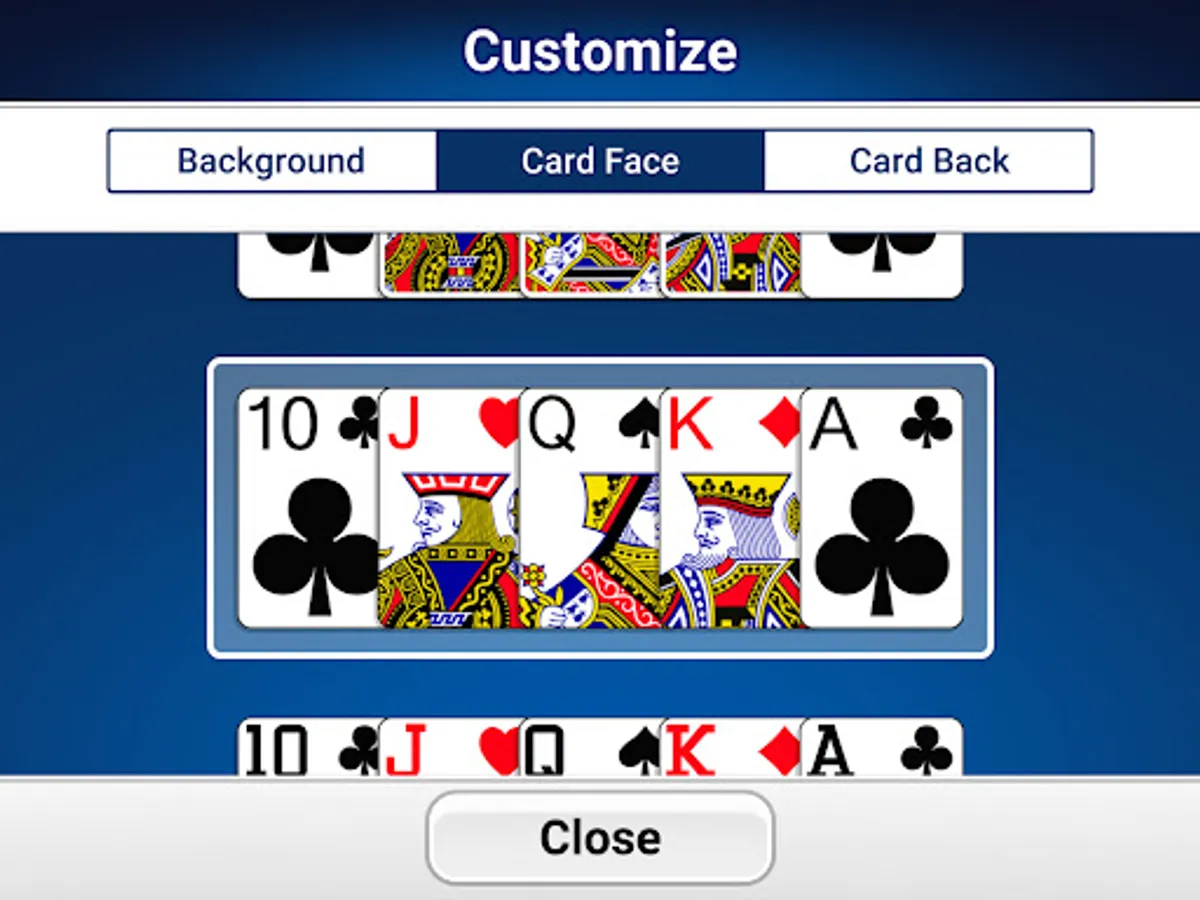 • Customization: Change your background, card backs and card faces for a personalized experience.