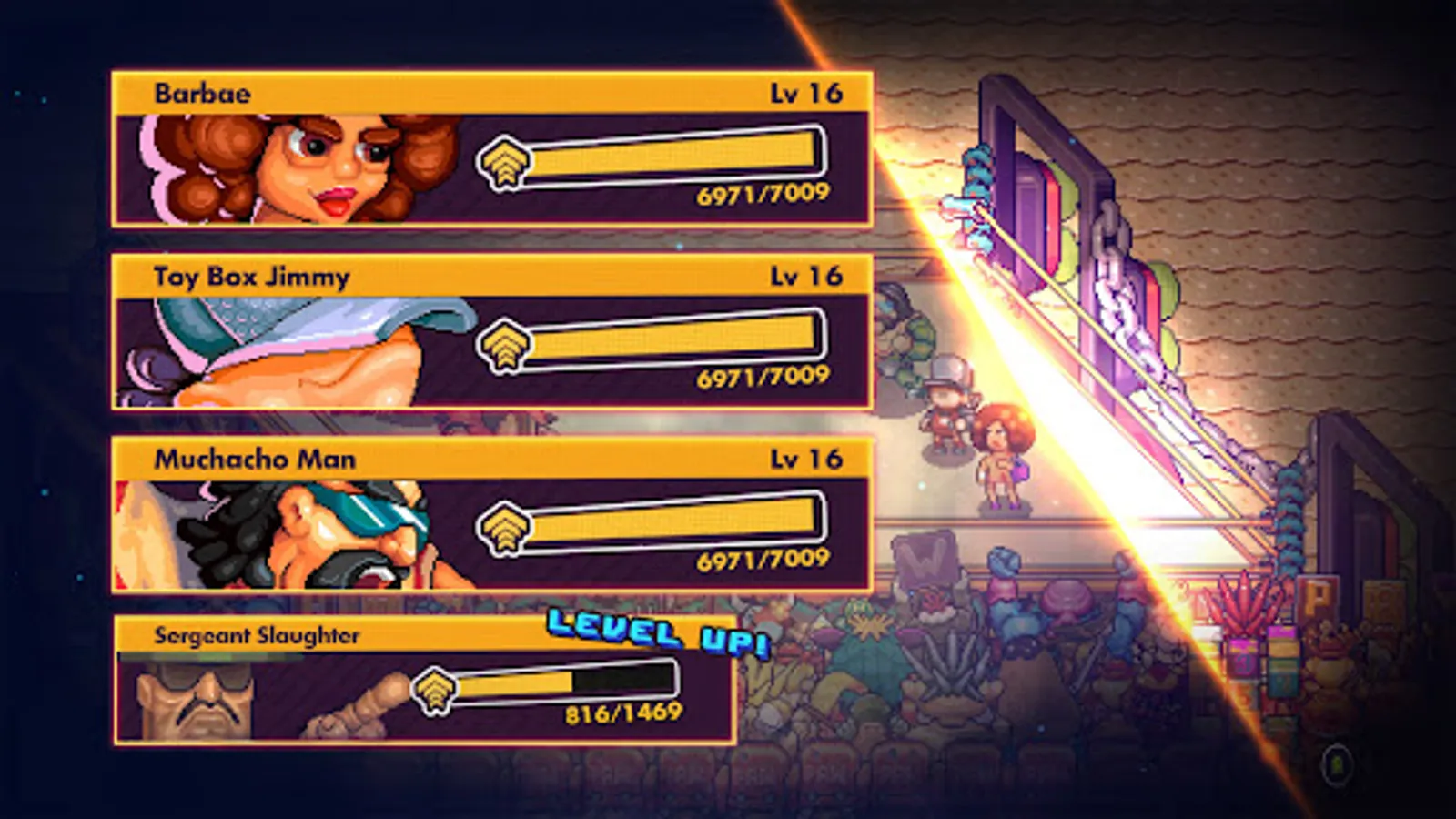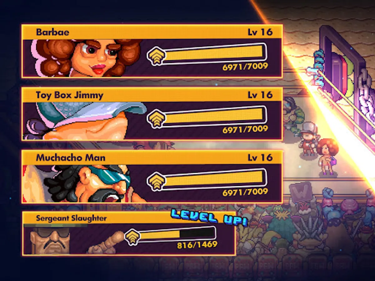 In this pixel-powered pro wrestling fantasy RPG, characters inspired by real-life icons guide you through your quest from aspiring rookie to superstar. "Macho Man" Randy Savage and many others offer guidance as you powerbomb your way to glory beyond the ring. Win rumbles, earn respect!