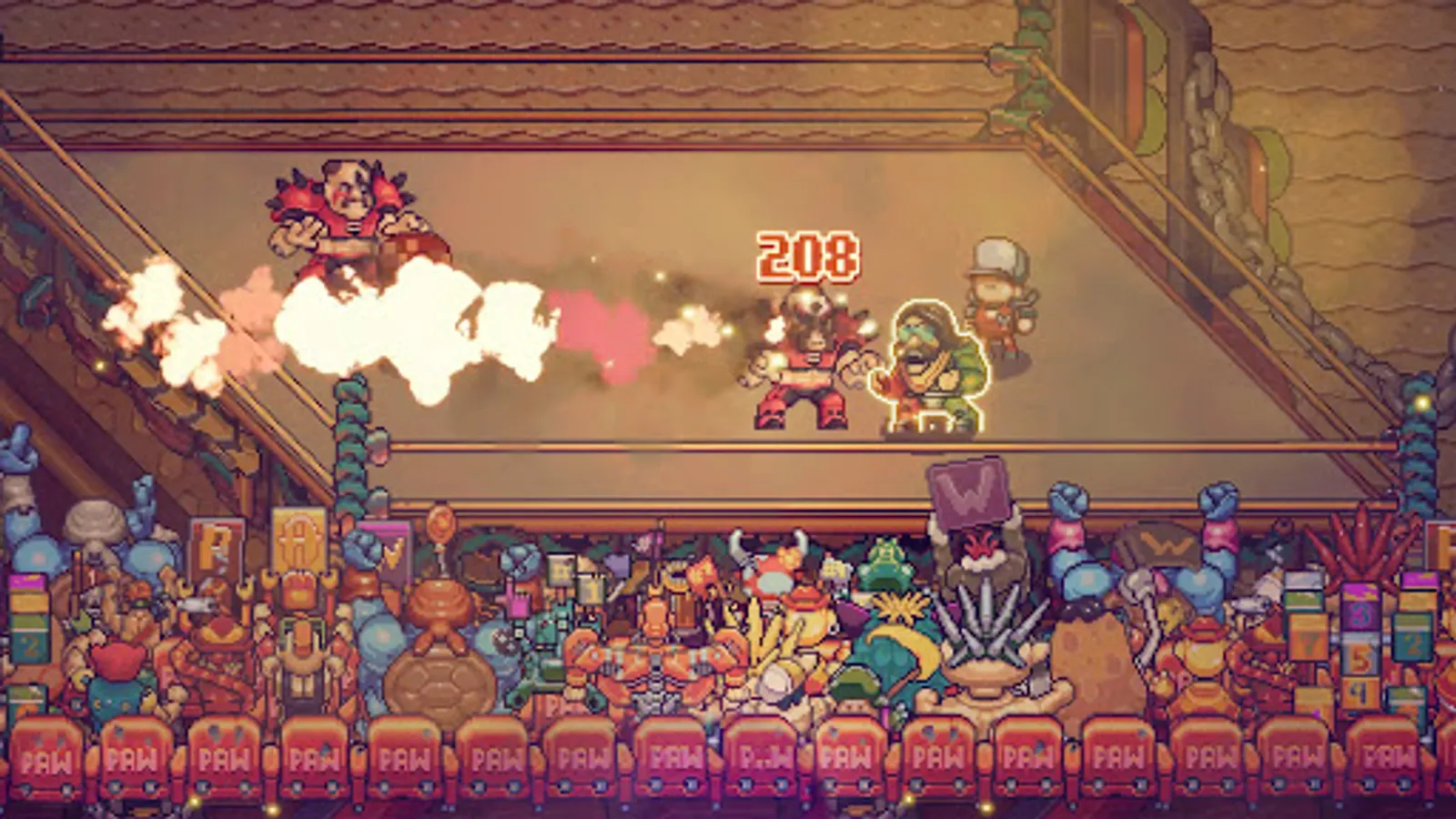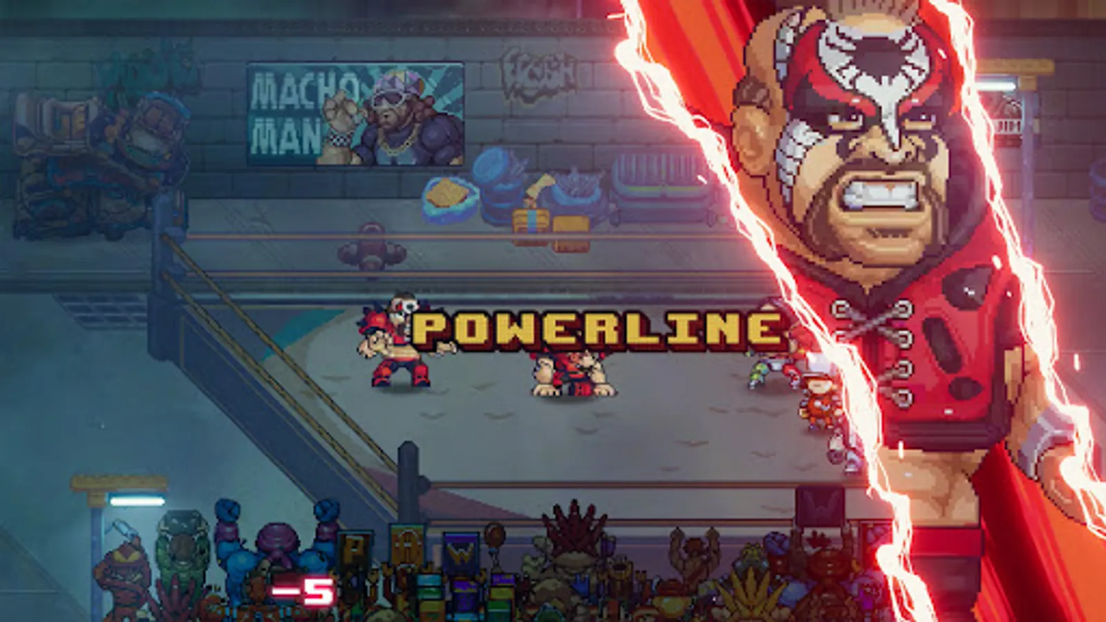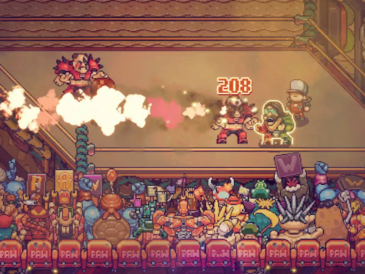 • Powerbomb and piledrive your way through a massive pixel art universe where professional wrestling and RPG fantasy collide.