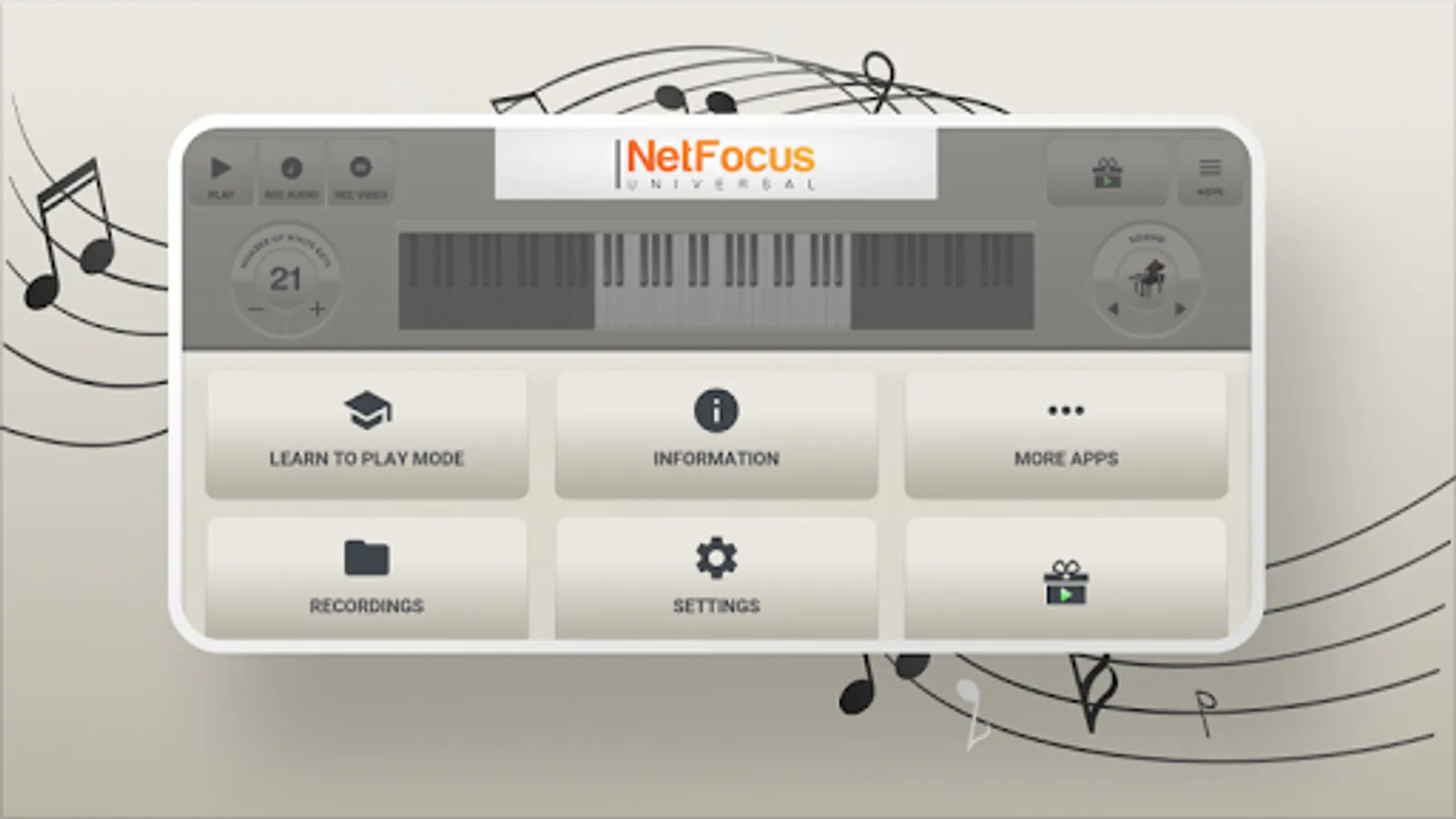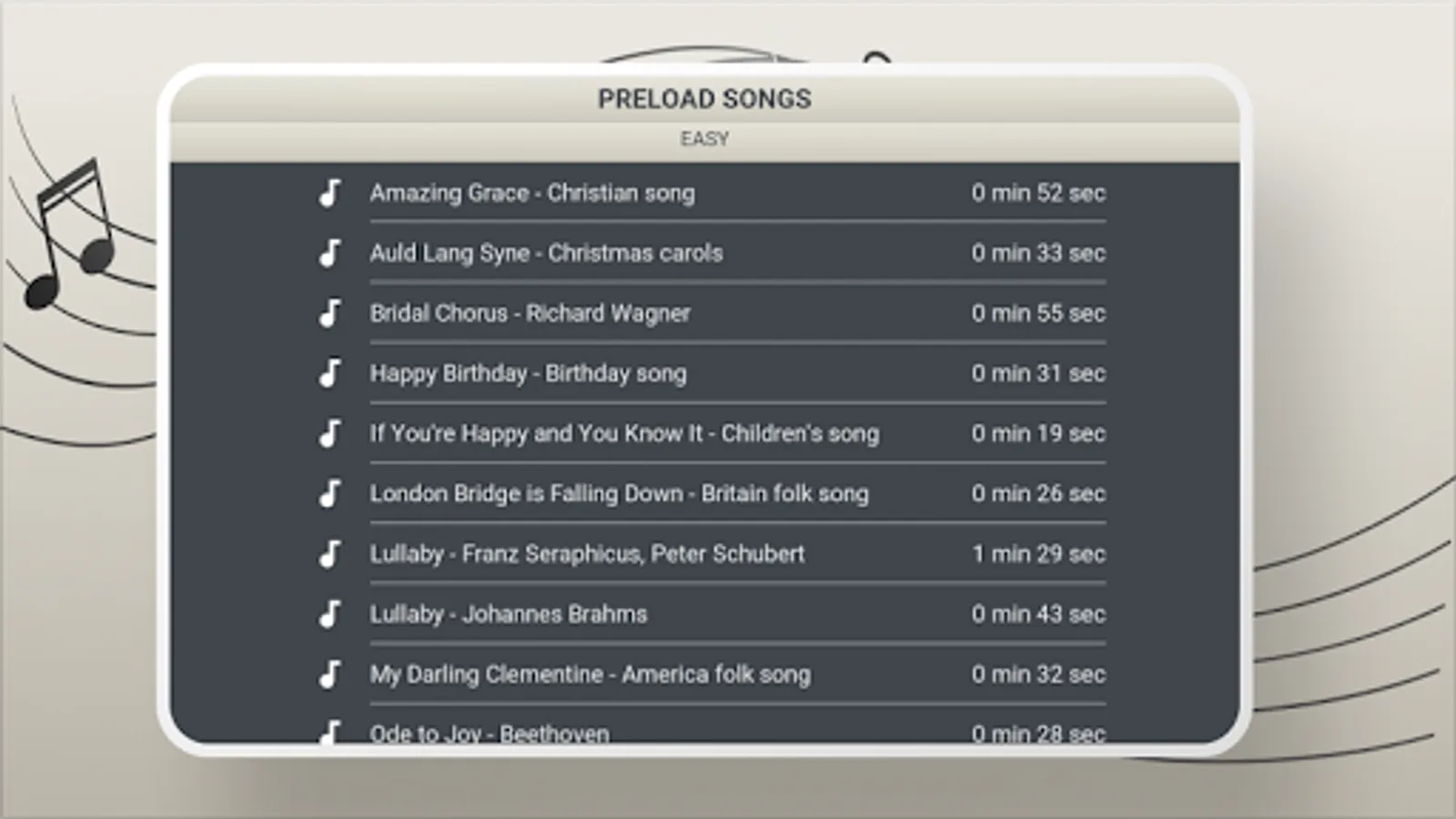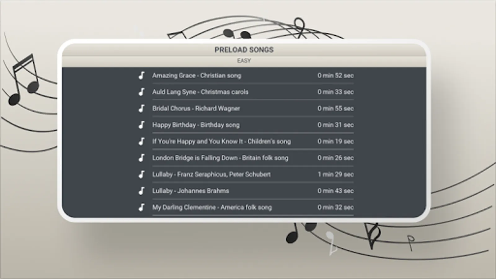 In Play Mode you can play without the help of our piano tutorial and record music, you can choose to only record audio or to record video view of screen and audio as you play. Recorded music files can be shared with family, friends and loved once.