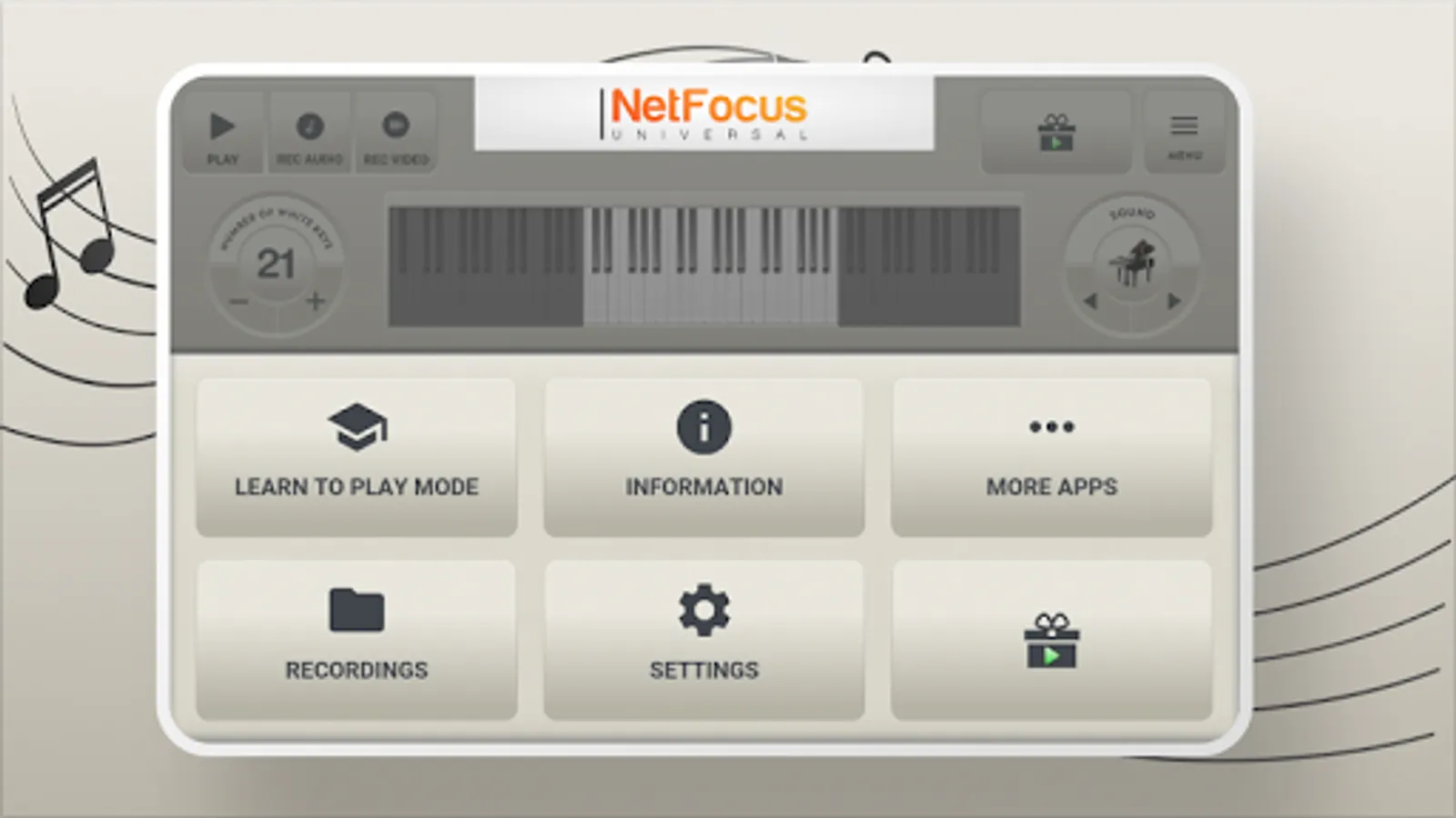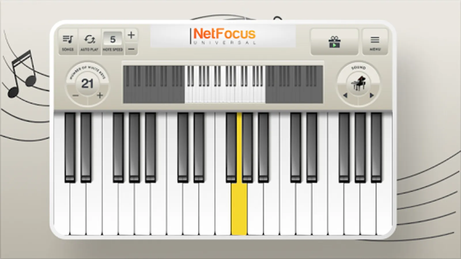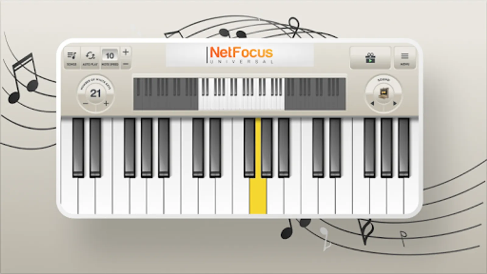 Most important buttons for functions are placed above the piano keyboard for best user experience and easy overview. If you have your own piano sheet music; you can choose to show label on keyboard piano keys in settings.