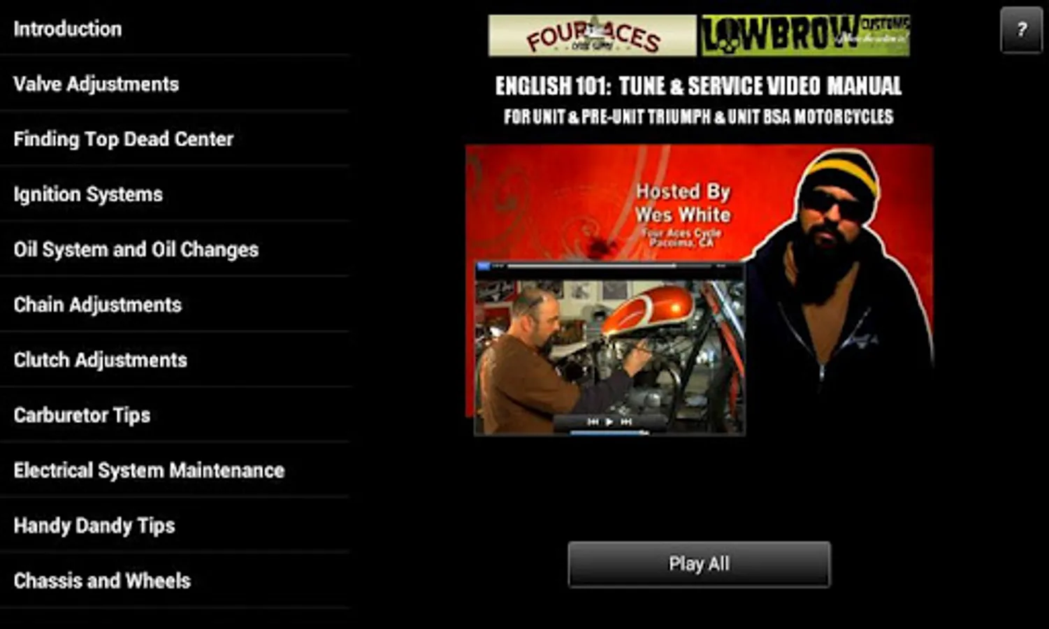 English 101 is a full tune and service application that covers pre-unit and unit Triumphs and unit BSAs. In this interactive application, watch step by step as Wes White of Four Aces Cycle demonstrates everything you need to keep your British bike reliable, on the road and running great. This 4 hour video is broken down into easy to follow chapters and is designed to teach you how to maintain your British Motorcycle.