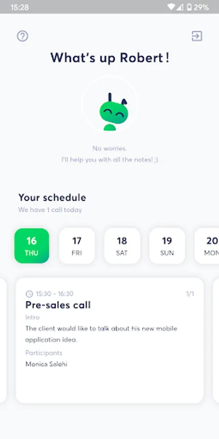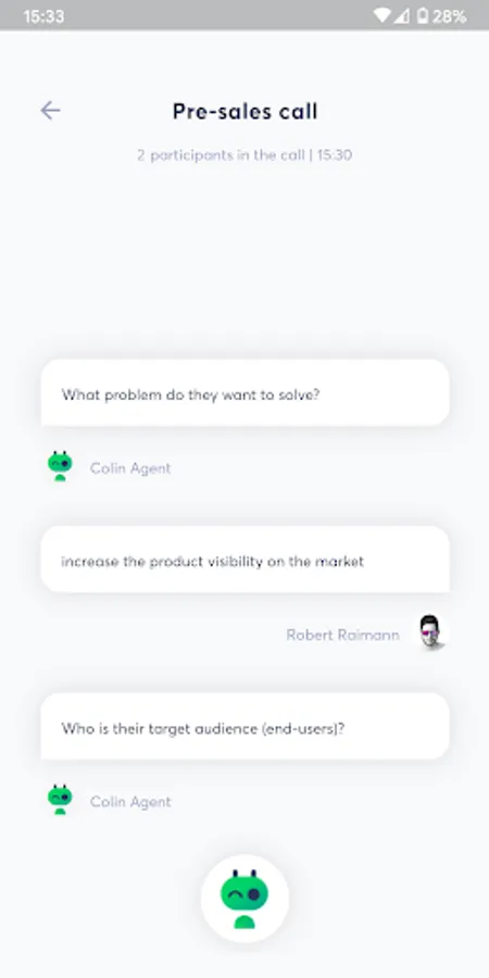 Hi! I’m Colin 👋. I integrate with your Google Calendar so that you won’t forget any important meetings! After each call, I’ll ask you some questions so that we can create together the best summaries ever! 🚀