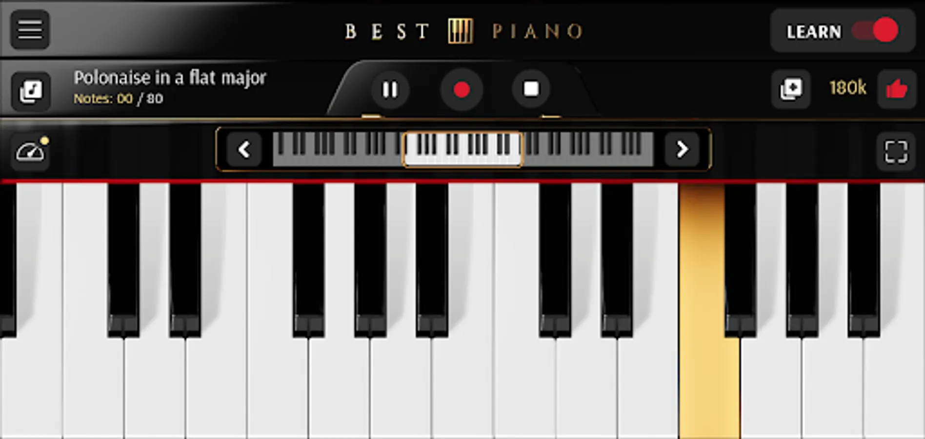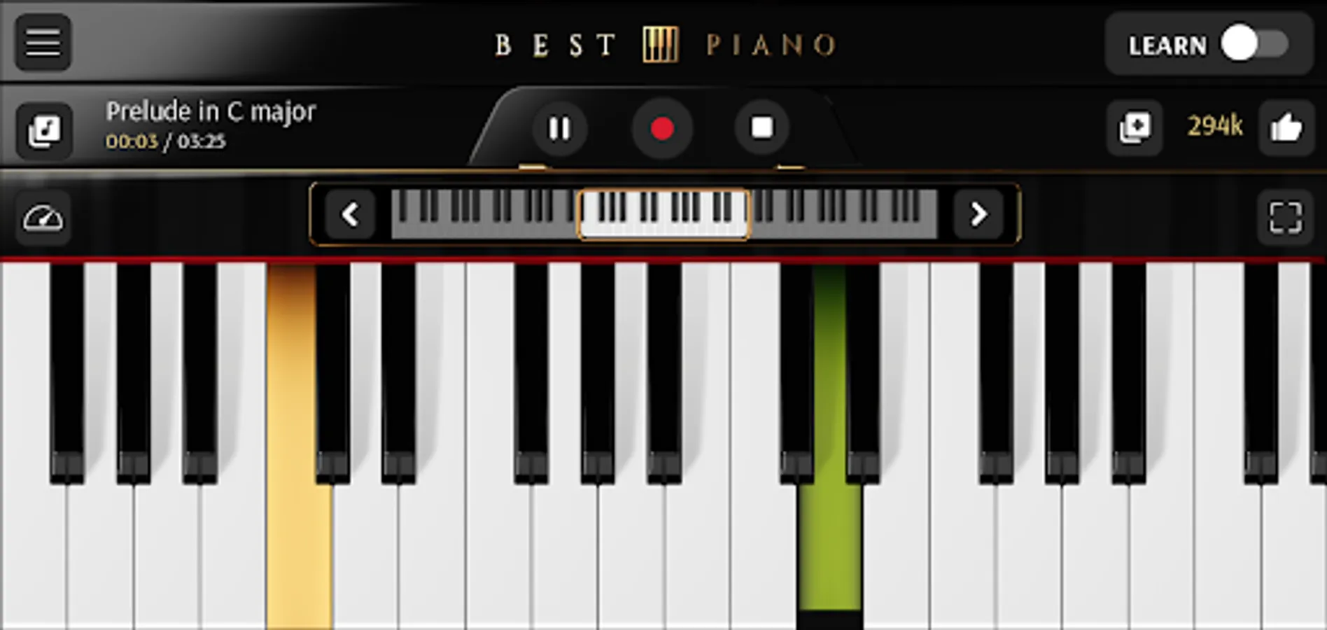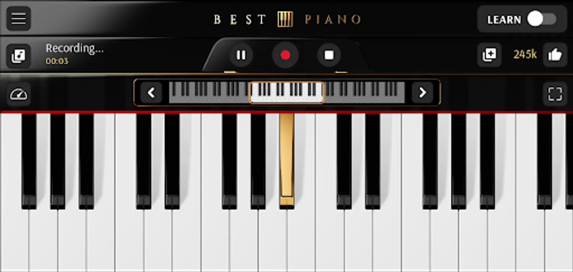The application can also be used as a piano without learning mode. There is also an option to record your own songs. The recording function will allow you to save your musical compositions and play them later. You can set the amount of visible piano keys from 10 to 24. You can move the keyboard with one key or one octave to the right or to the left. This magic keyboard piano will be like your virtual teacher.