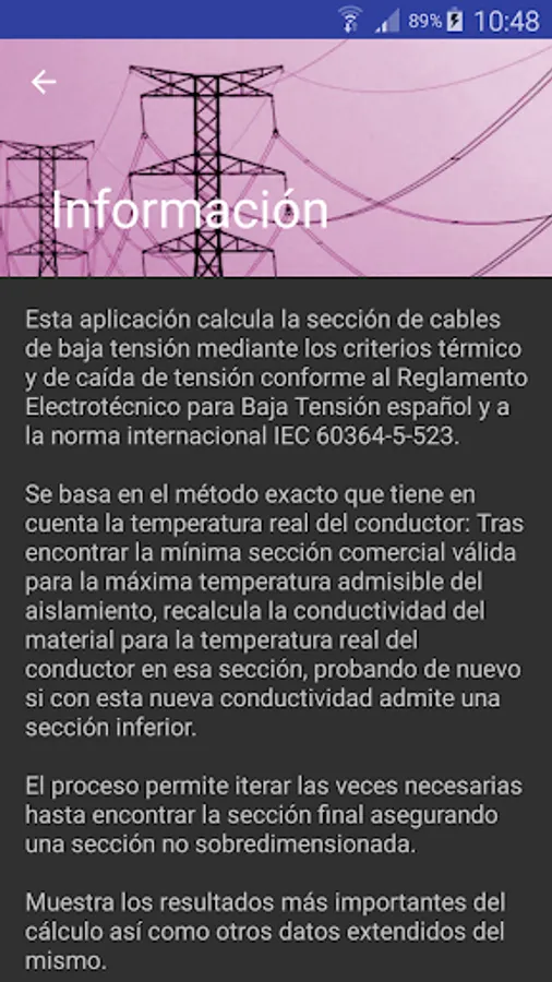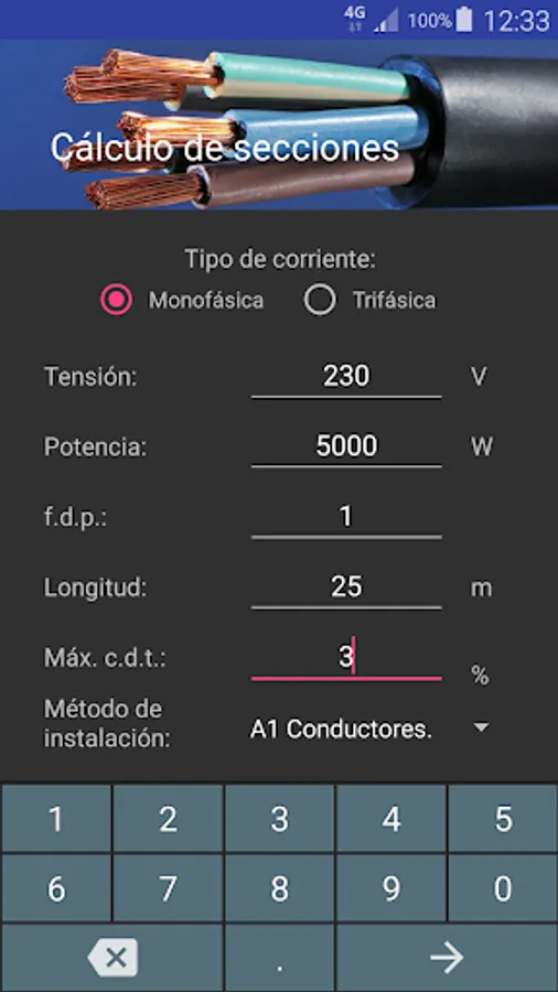 This application calculates the section of low voltage cables through thermal and voltage drop criteria pursuant to Regulation for Low Voltage Spanish and international IEC 60364-5-523 standard.