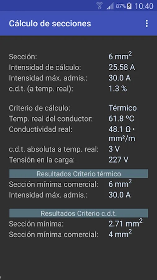 It is based on the exact method that takes into account the actual temperature of the driver: After finding the minimum valid commercial section for maximum allowable temperature insulation, recalculates the conductivity of the material for the actual conductor temperature in that section, proving again if with this new conductivity supports a lower section.