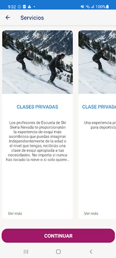 With this magnificent mobile application, you can book classes or rent materials at the prestigious Sierra Nevada Ski School with the best ski instructors in the territory. Your classes just one click away. Inside you can also find information about the services we provide you, the monitors that we have, contact methods and a history of reservations and rentals that you have made as a client.