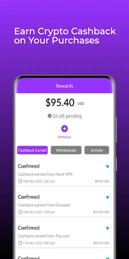 Use Netkoin to shop at hundreds of online stores, including Microsoft, Groupon, Trip.com, NordVPN and more! With Netkoin, you can earn crypto cashback on all your purchases made through the app.