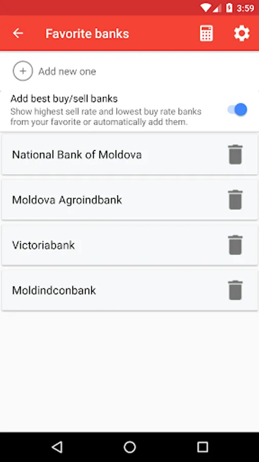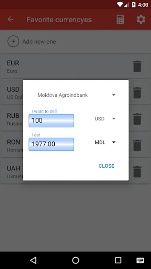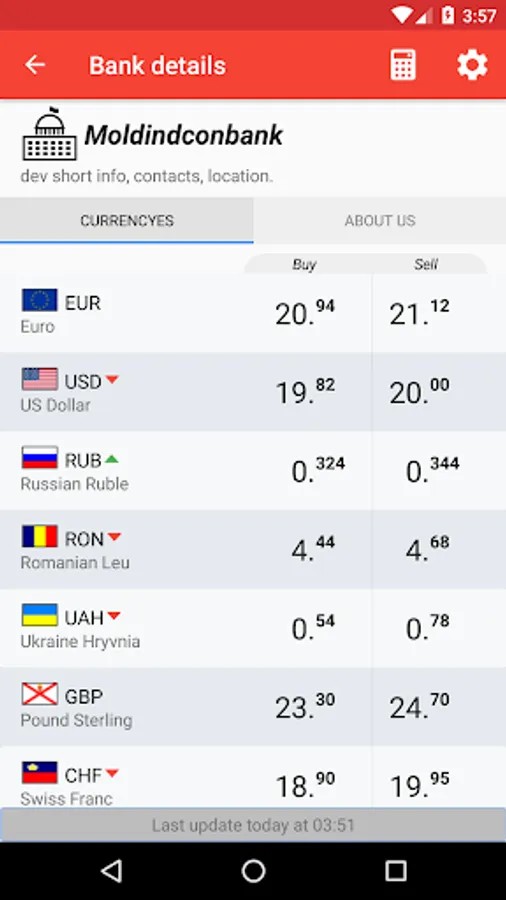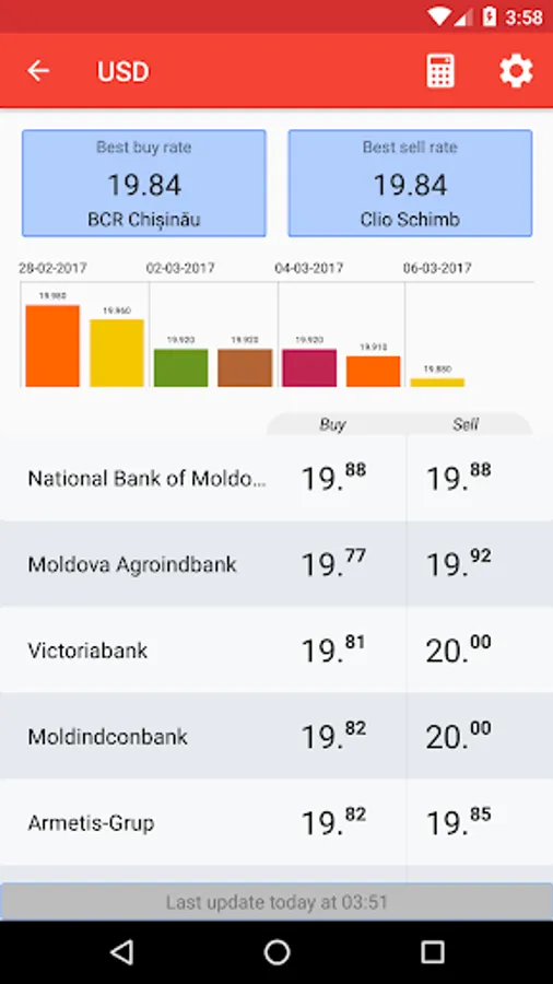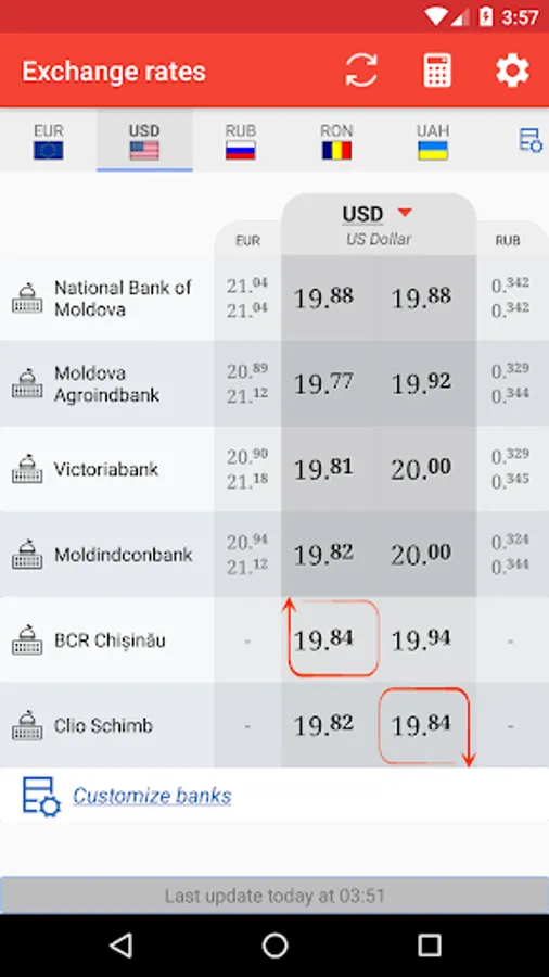 We provide you exchange rates from such banks as: Banca Națională a Moldovei, Victoriabank, EuroCreditBank, Moldindconbank, Moldova-Agroindbank, BCR Chișinău, Energbank, Eximbank, Mobiasbanca, ProCredit Bank, Comerțbank, FinComBank;