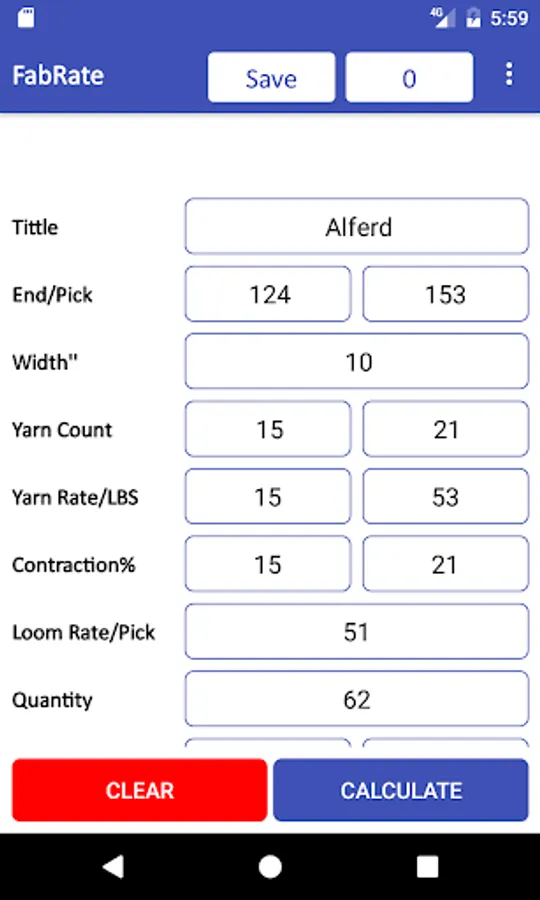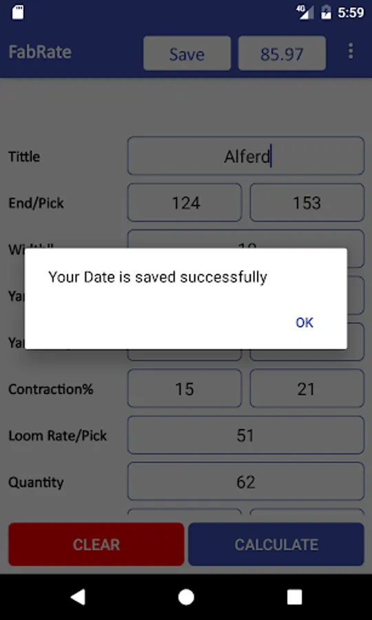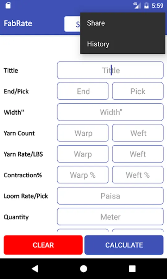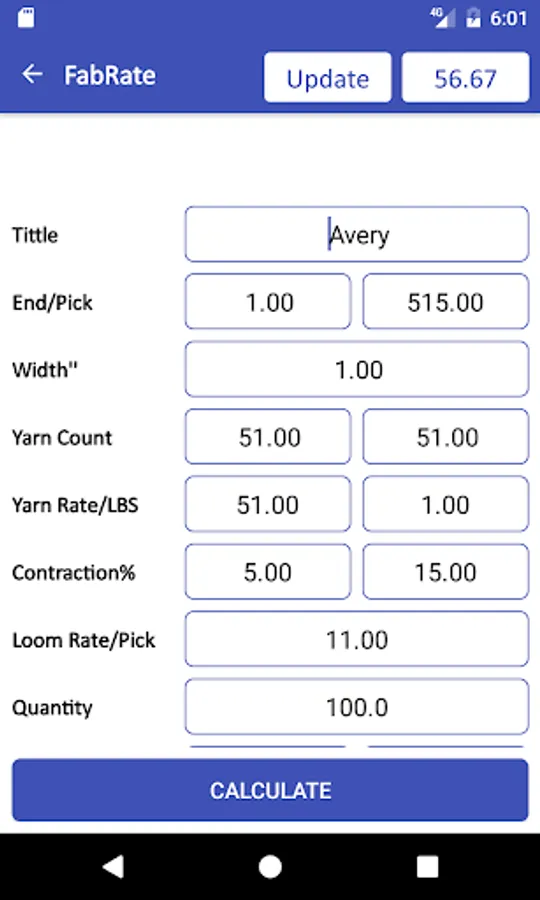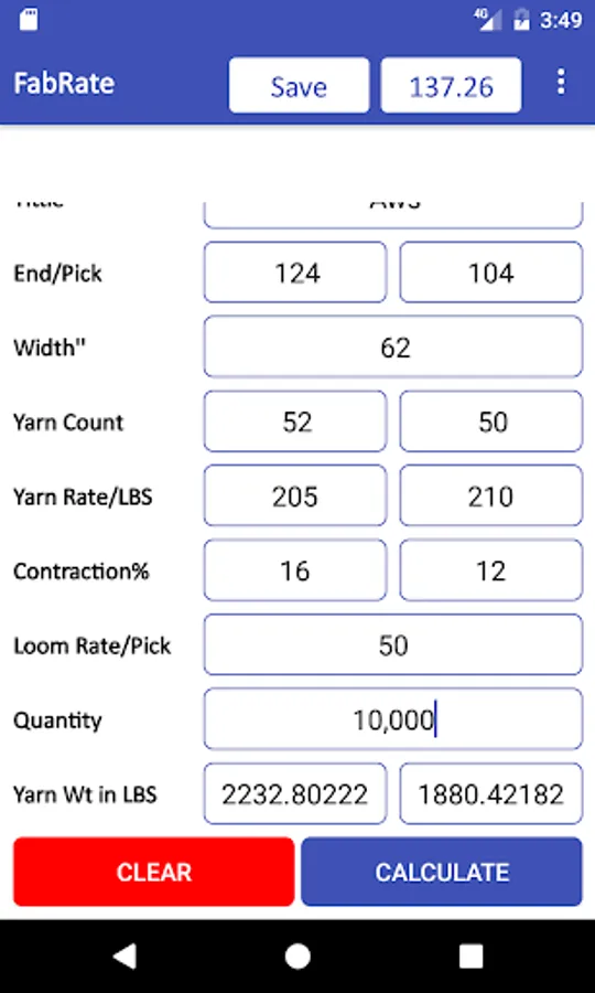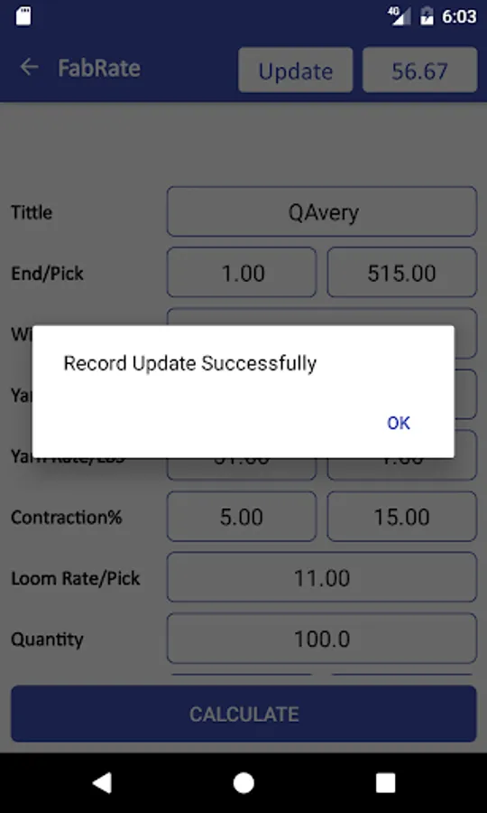 You just after entering required information Click on the Calculate button and the Fabric rate calculated automatically is shown in the Top Bar of App and Warp Weight and Weft weight is calculated in the specified place you see.