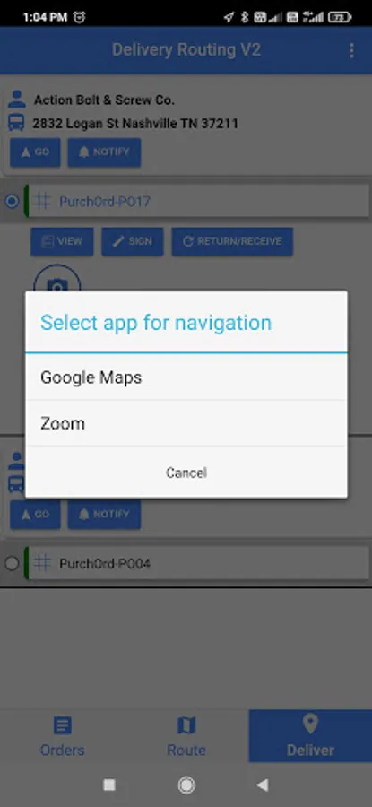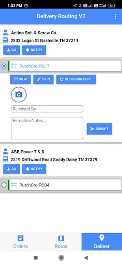 Drivers use a mobile application on any Android or IOS device to be guided through their route, receive turn-by-turn instructions, capture signatures, and even take pictures of delivered items.