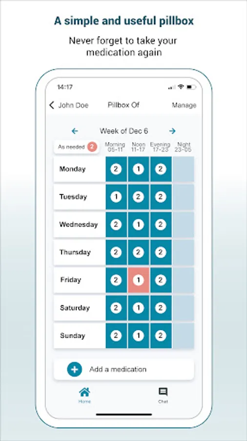 • Track your medication with a virtual pillbox;