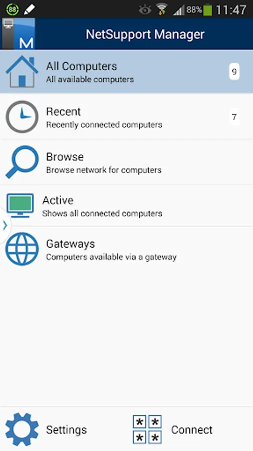 The mobile Control allows a user to quickly search and connect to both local computers by either IP address or PC name, or to browse, connect and view remote computers utilizing the free NetSupport Manager Internet Gateway component.