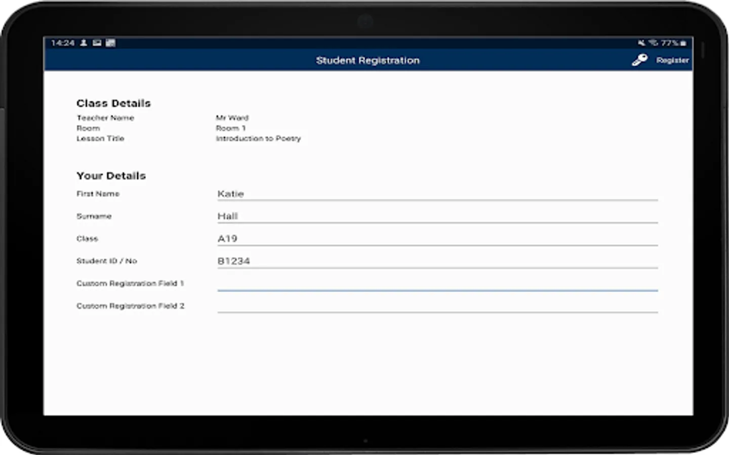 - Student Register: The teacher can request standard and/or custom information from each student at the start of each class and create a detailed register from the information provided.
