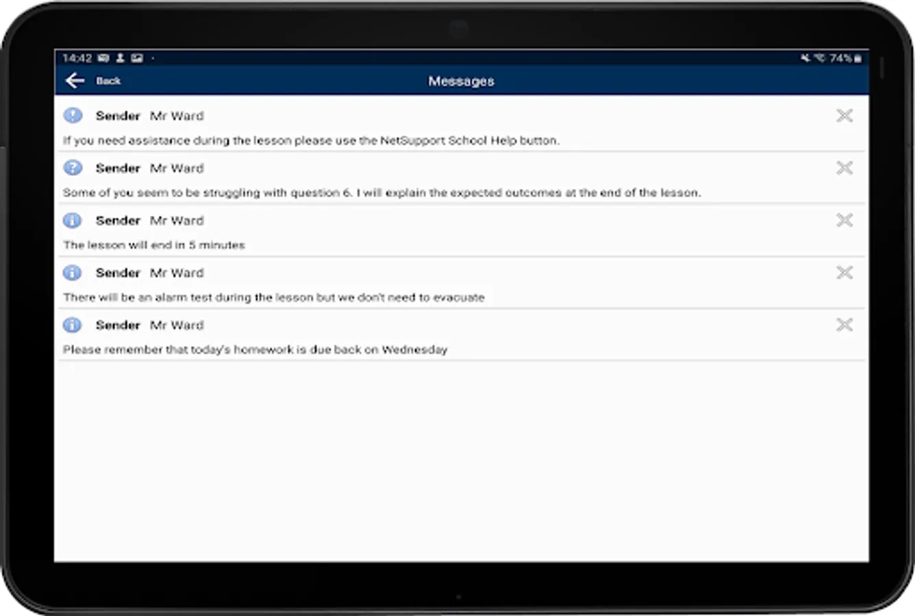 - Sending Messages: The teacher can broadcast messages to one, selected, or all tablet devices.