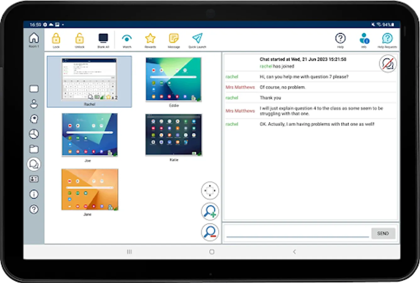 - Chat and Message: Initiate teacher-to-student chat sessions and send messages from the teacher device to one, selected, or all student devices.