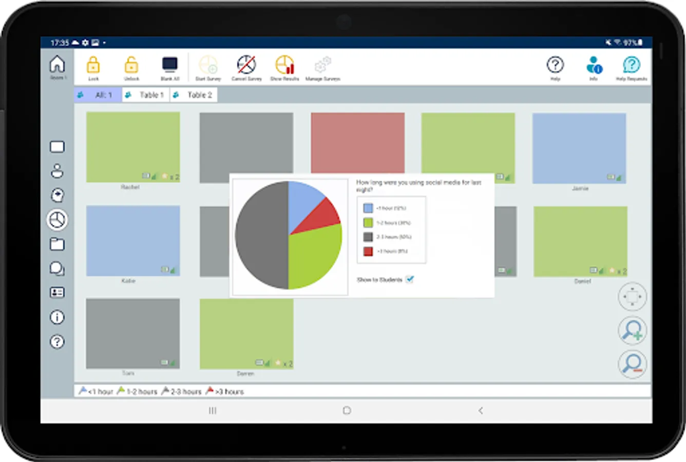 - Class Surveys: Teachers can conduct on-the-fly surveys to gauge student knowledge and understanding. Students are able to respond in real-time to the survey questions posed and the teacher can then show results to the whole class, enabling students to receive instant feedback on their progress.