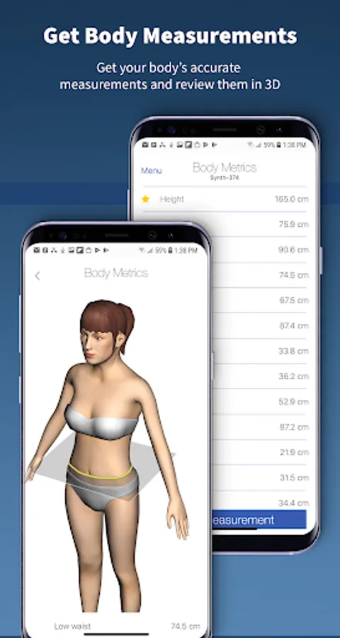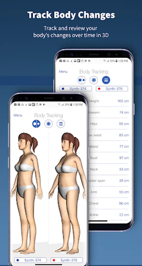 - Track how your body changes in 3D. You can compare two bodies with full side-by-side view, morphing animation and dimension comparison - all in 3D on your device.
