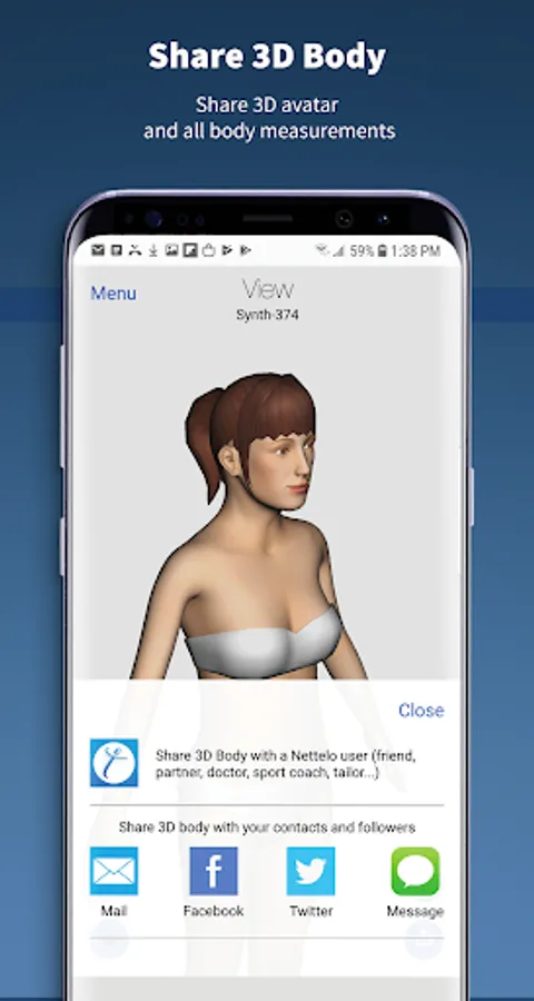 - Send your 3D body and its measurements by email or share it on Facebook and Twitter.