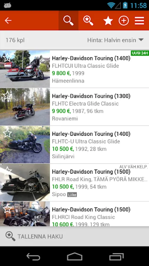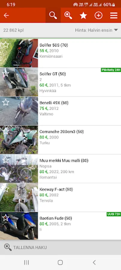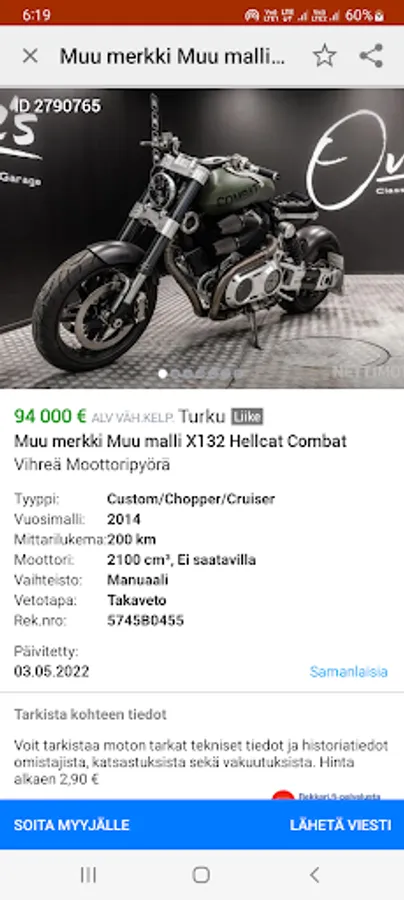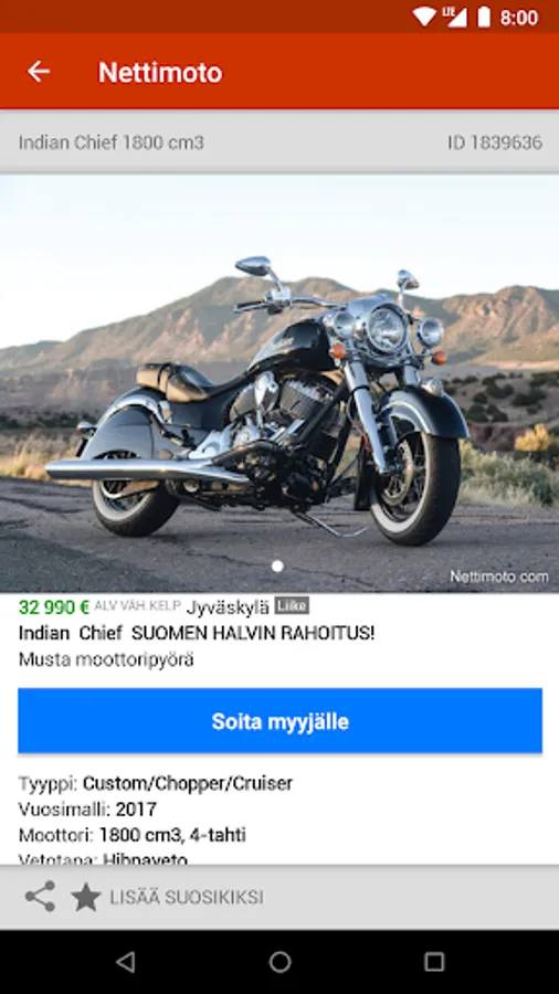 Nettimoto is Finland's most popular marketplace for motorbikes. In the Nettimoto application, you can search for all new and used motorcycles, ATVs, snowmobiles, mopeds, scooters and other two-wheeled vehicles for sale at Nettimoto with precise search criteria, save favorite searches and mark interesting announcements in the Favorites list. Each motorcycle for sale has 1-24 pictures, detailed technical information and the seller's contact information. You can also read the questions asked to the seller and see the seller's location on the map and send private messages to the seller. Log in with your Alma credentials so you can leave and manage your own announcements and reply to messages.