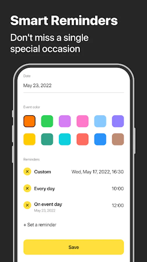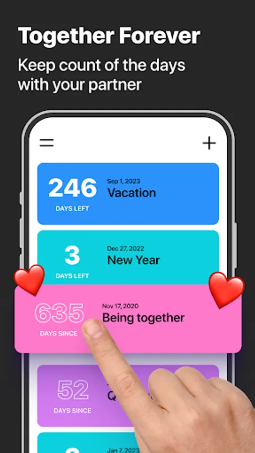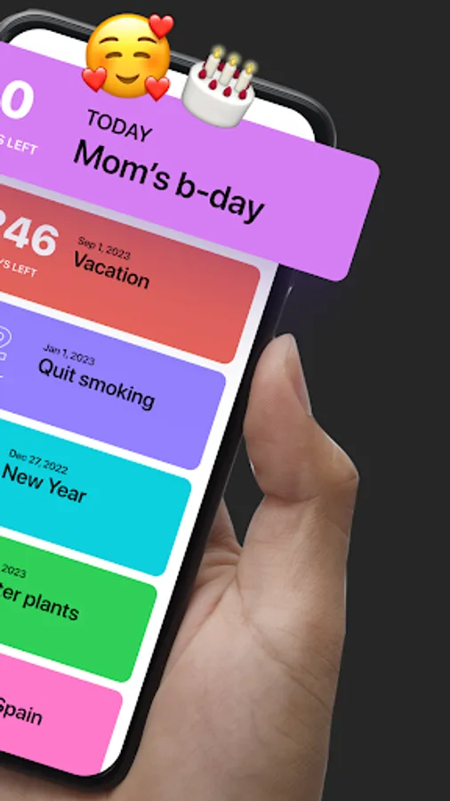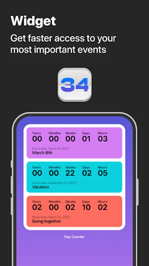 • Track the number of years, months, weeks, days, minutes, and seconds left to your important events