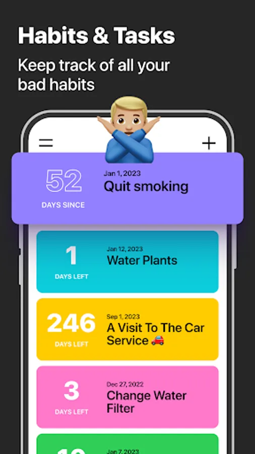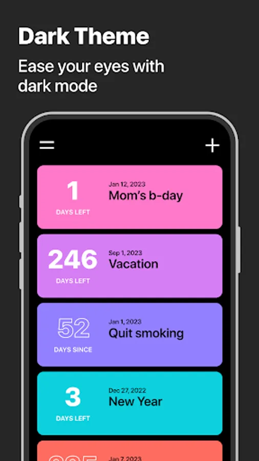 Days Counter works in two modes: count-up and countdown. You can use a countdown mode to stay up to date on the number of days until upcoming special events, which will help you be prepared without hassle. It facilitates you in tracking years, months, weeks, days, hours, minutes, and seconds until your events. Similarly, you can use count-up mode to track the number of days that have passed since you started a project or an event that facilitates your tracking progress. It has the option to count down the years, months, weeks, days, hours, minutes, and seconds since your events.