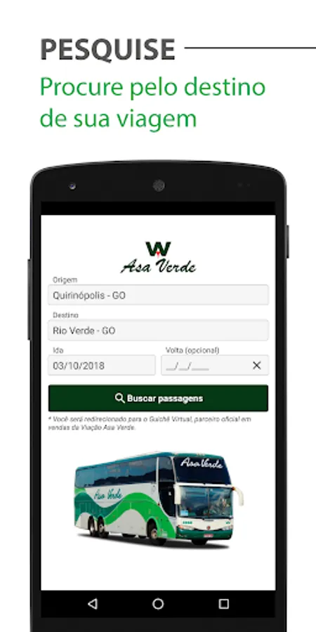 Application for purchase of bus tickets of Viação Asa Verde. You guarantee your seat in advance of where you are and with the same price of the bus station. Travel with Asa Verde in the state of Goiás. Download FREE application!