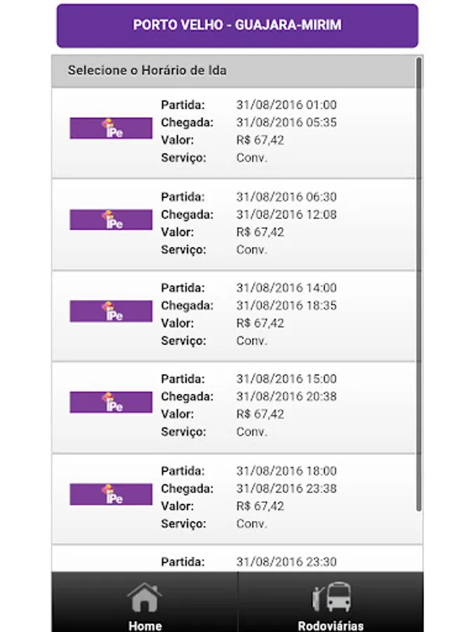 Application to search and buy bus tickets company Ipe Transportation to major destinations in Brazil. Additionally, you find the address of the main road of Brazil.