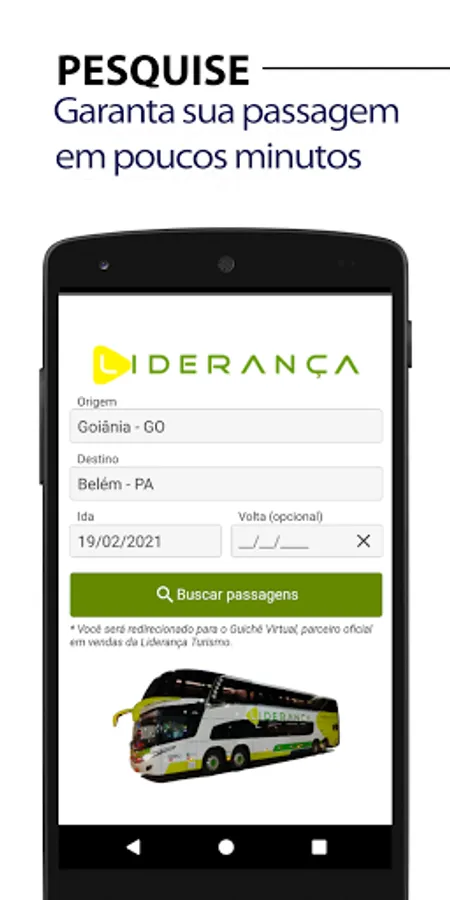 Application for purchasing bus tickets from Viação Liderança. You guarantee your seat in advance from wherever you are. Download the app for FREE!