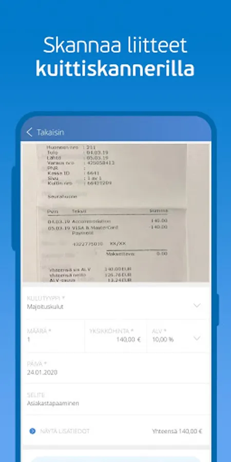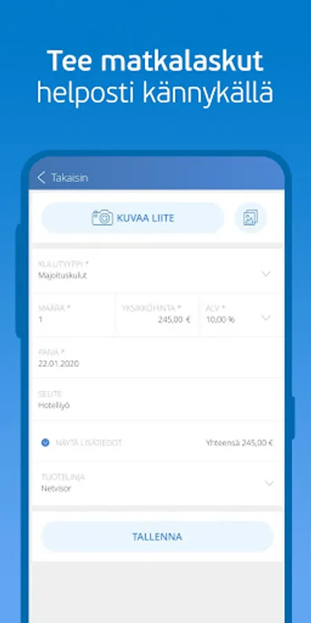 Make travel expenses effortlessly with your own phone. Enter your travel invoice details, scan receipts, attach them to your travel invoice and submit for approval. You can also see the status of past travel invoices from the app.