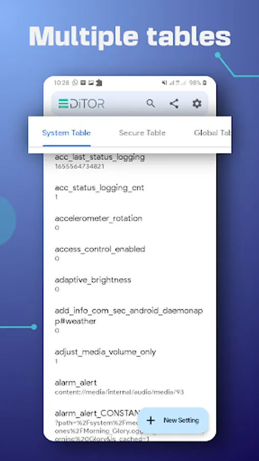 SetEdit app shows you the content of the android settings config. file, or the so-called settings database as a list of key-value pairs – inside SYSTEM, GLOBAL, SECURE or ANDROID properties tables – then allows you to set, edit, delete or add new ones. SetEdit app can be an invaluable tool if you know what are you doing. however, if you're not careful it is very likely to mess something up.