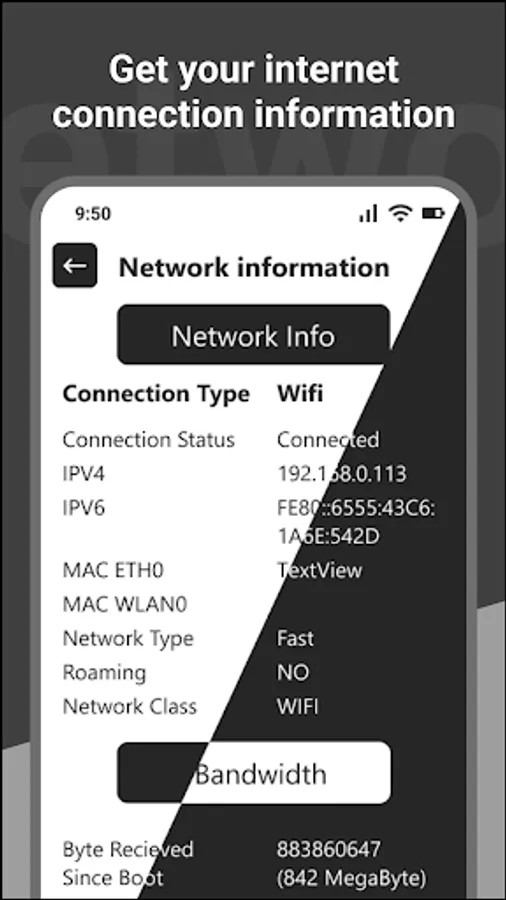 - Bandwidth Info like download speed, byte received since boot, byte transmitted since boot.