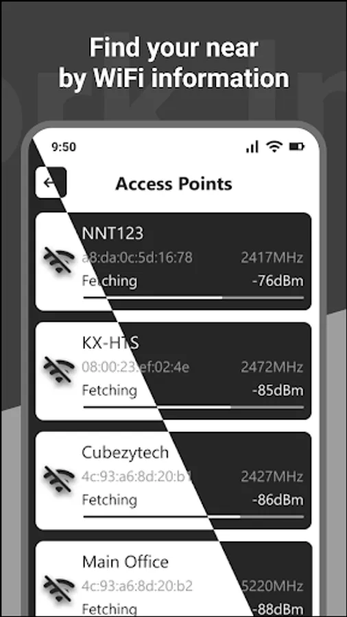 - Scan for available WiFi connection with mac address, bandwith and MHz details.