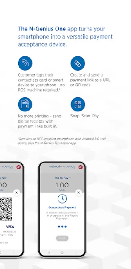 Do you accept cards? With the N-Genius One mobile app, there’s no need to invest in any hardware in order to receive contactless payments. All you need is the N-Genius app, and your smartphone transforms into a payment acceptance device , taking payments from VISA and Mastercard users with contactless cards or NFC-enabled payment devices like smartwatches and smartphones running Tap to Pay wallet apps.