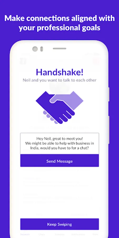 The app is simple, just join the communities that interest you and swipe interested or skip on fellow members. When the other person is also interested in you, you have a "handshake" and you can use the in-app chat to quickly schedule a meeting.