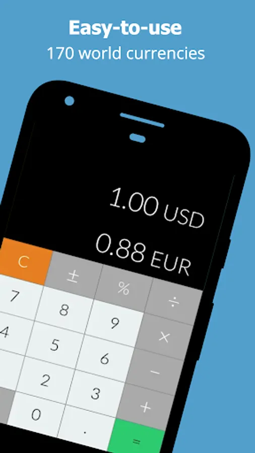 Key features include frequently updated currency conversion rates, over 170 currencies supported, plus offline mode that works without internet connection.