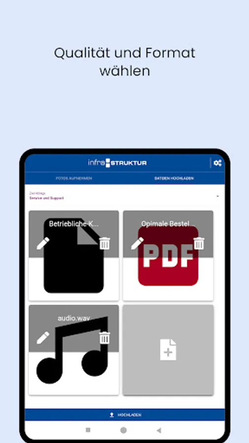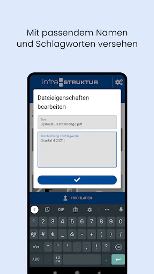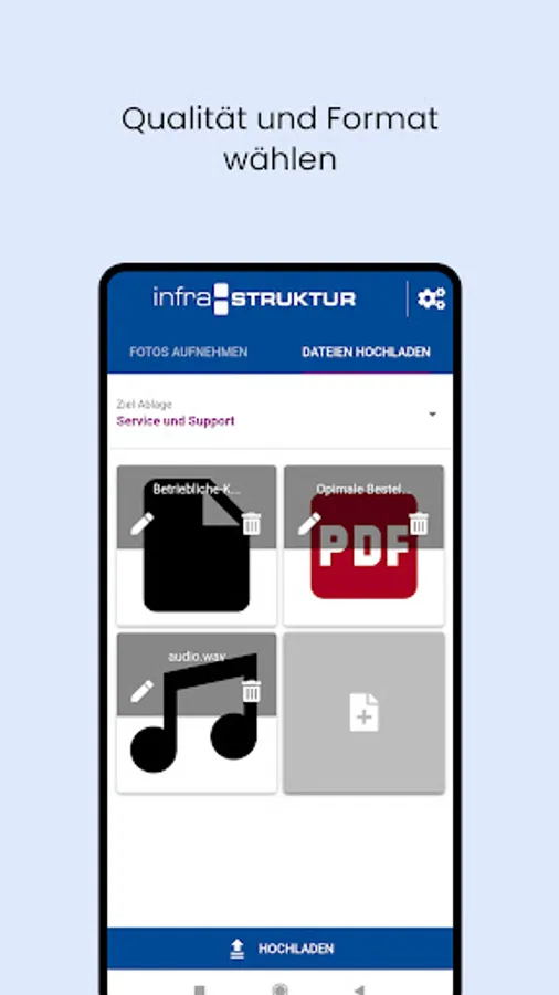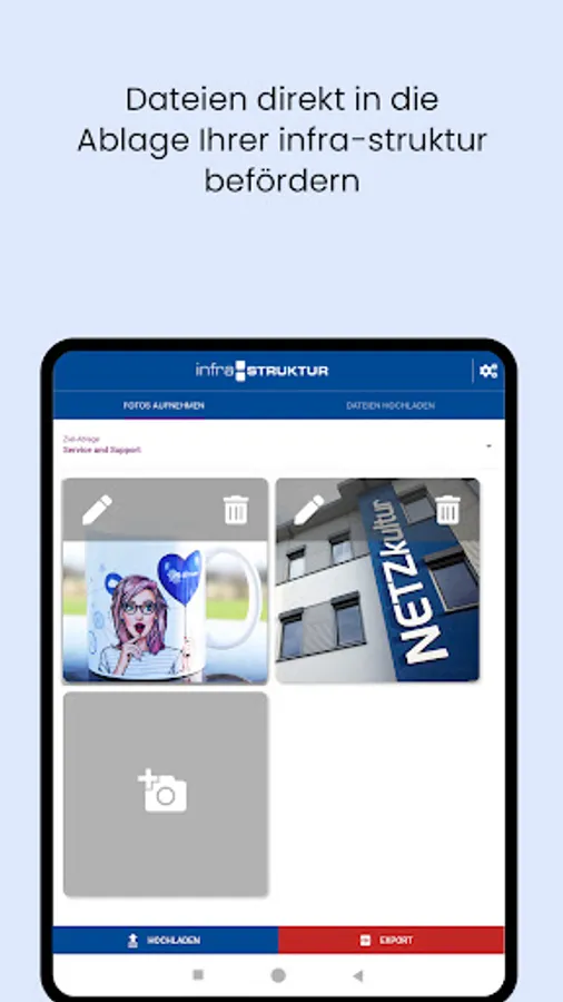 Transfer files directly from the mobile device to the document storage of your infrastructure - the infraUpload app makes it possible! - Regardless of whether it is photos, PDFs or other formats - with a few clicks the data is available on demand in your infrastructure.