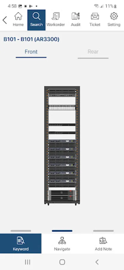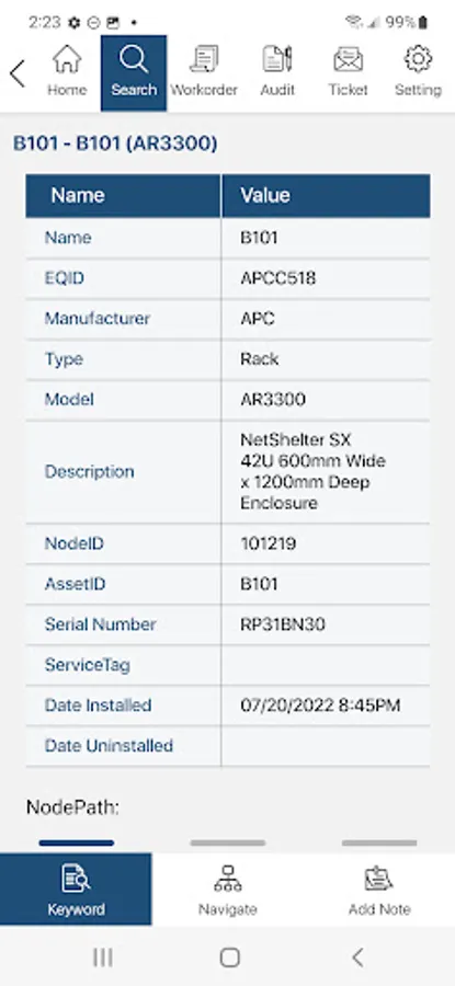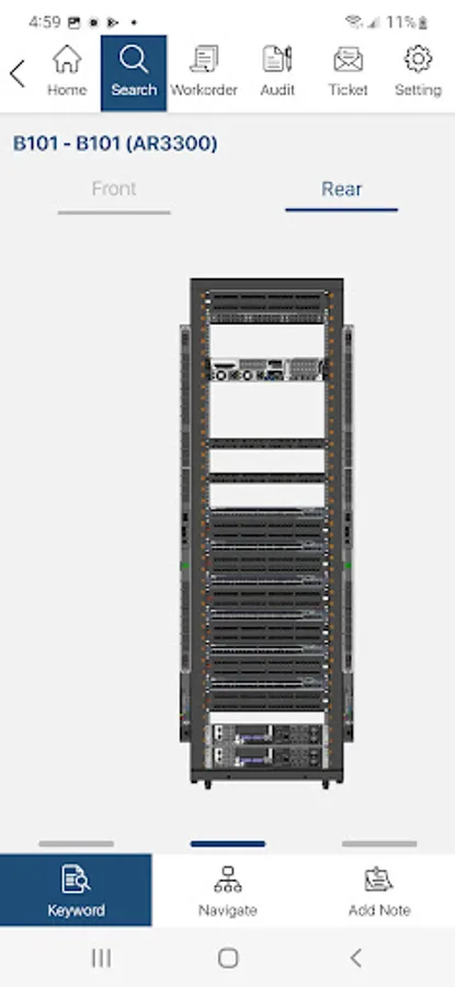 · Search for assets by keyword or navigate the data center to review asset information, where it is installed, see front and rear graphical views of the asset and review any pending alerts