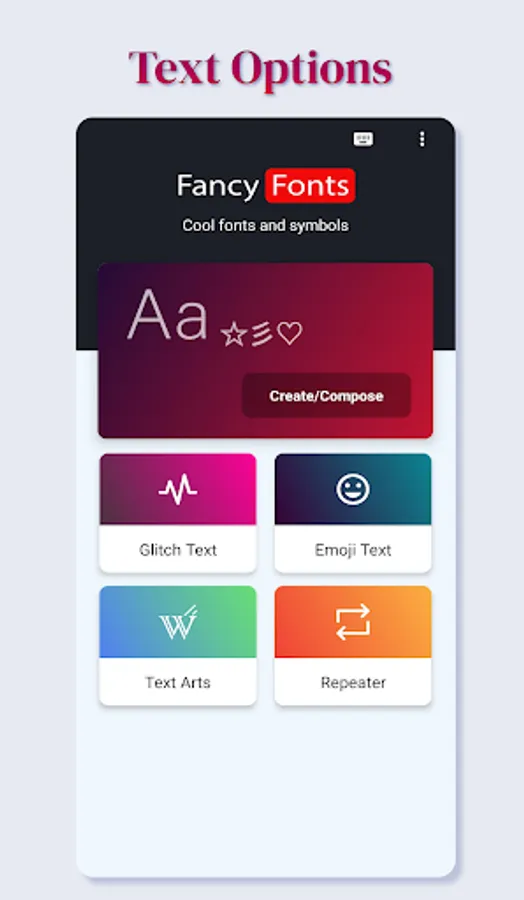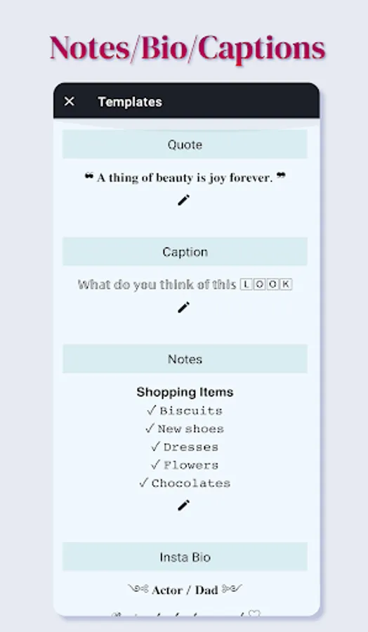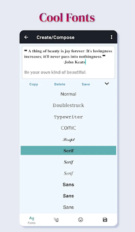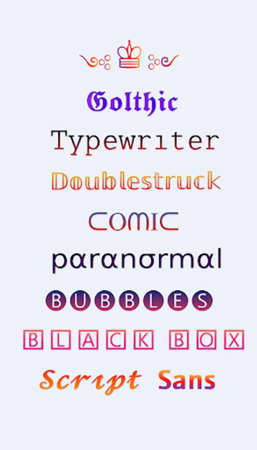 Contains all sort of popular fonts that you can use anywhere. You can use the fonts in chat messages, decorate text, create quotes and lyrics, write insta and tiktok bio and write stylish notes with fancy fonts app.
