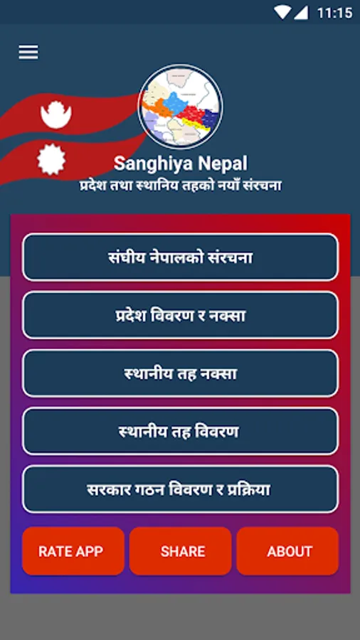 नेपाल को नयाँ संघीय संरचना आन्तर्गत नव गठित सात प्रदेशको नक्सा र विवरण (मुख्य मन्त्री , समाबेस भएका जिल्ला , छेत्रफल ,जनसन्ख्या ) र नेपाल सरकारले २०७३ फागुन २७ गतेदेखी लागु गरेको स्थानीय तहको बिस्तृत नक्सा र समावेश गाविस / नगरपालिका, वडा संख्या, जनसंख्या क्षेत्रफल, प्रस्तावित केन्द्रको विवरण यस एप मार्फत सरल तरिकले प्रस्तुत गरिएको छ .