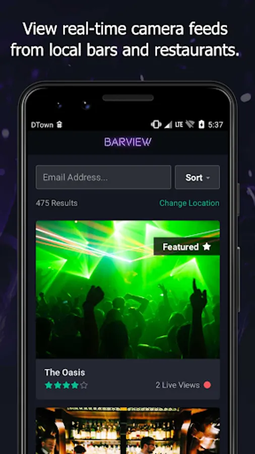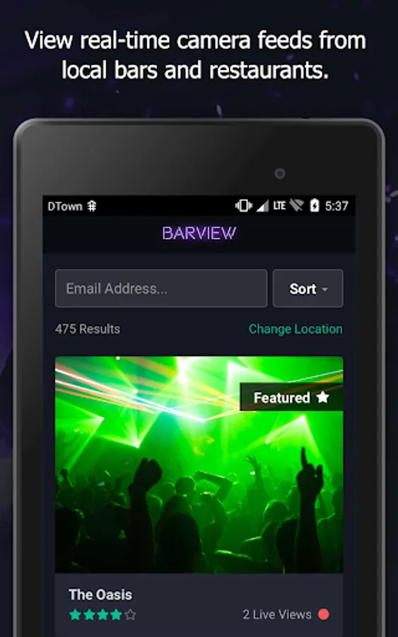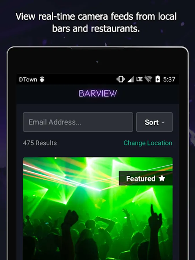 BarView is a multi-platform application that allows you to gain access to real-time camera feeds of local venues. You can browse for menu specials, checkout events, and receive the most updated business activities all on one platform. When browsing the app, you have the ability to “favorite” a venue which will then send notifications on upcoming events, specials and activities. After signing up for the BarView you will create a custom profile that will help tailor your experience.