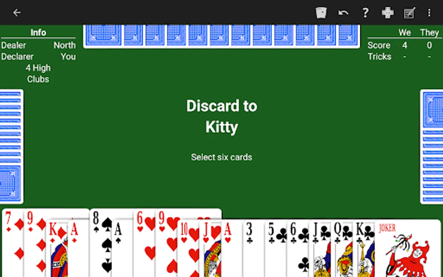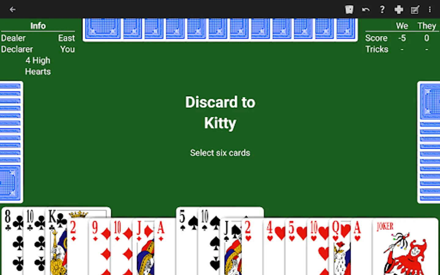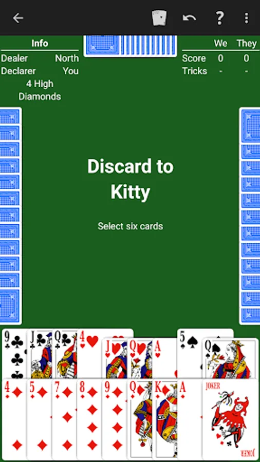 • Kitty size. Choose the size of the kitty: 6 cards, 5 cards, 4 cards, or no cards.