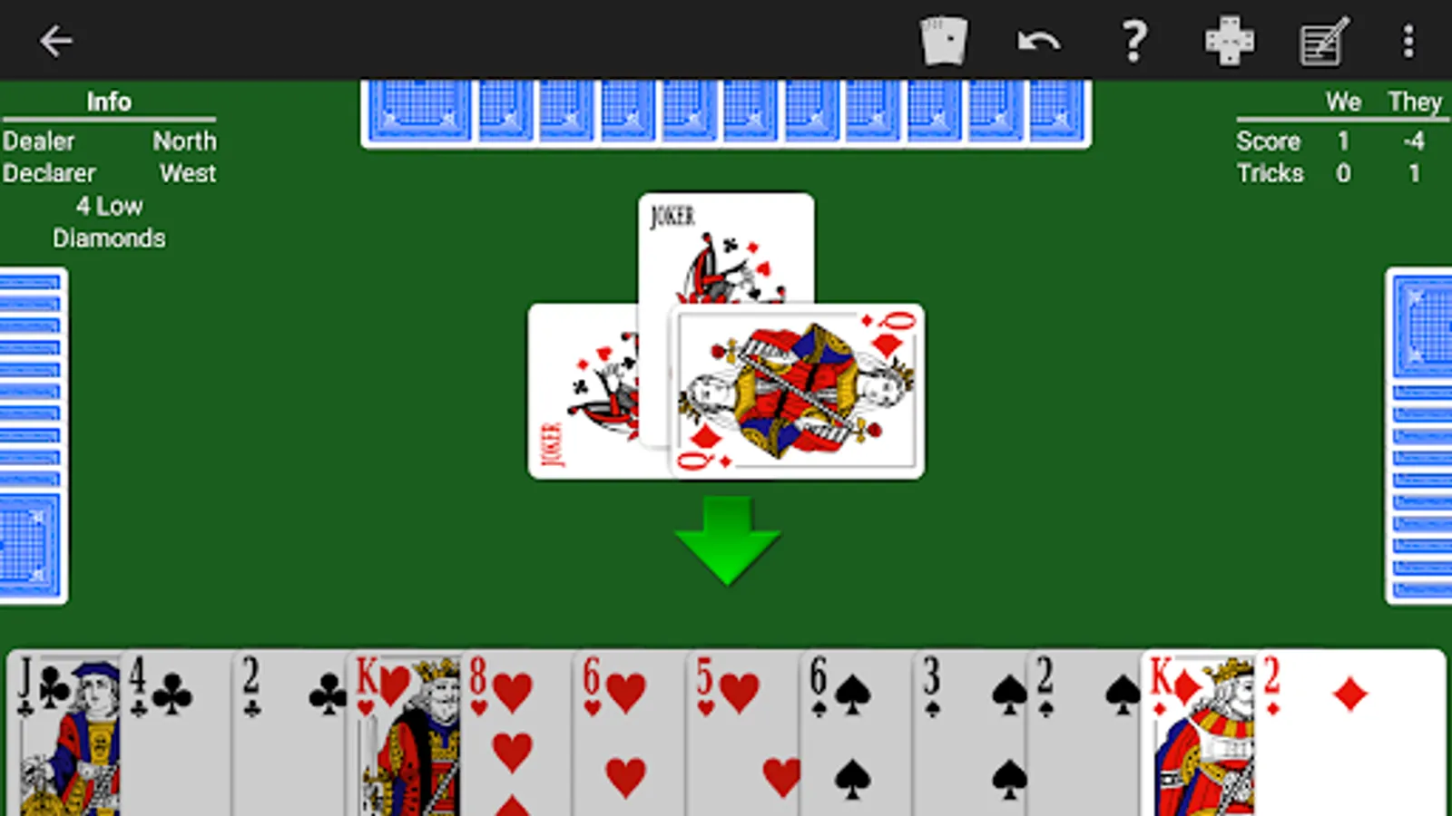 • Joker play during notrump contracts. Choose how jokers must be played during notrump contracts: can be discarded anytime one does not have the suit lead; must be discarded as soon as one does not have the suit lead; may be played anytime but will not capture the trick; or must be placed in the kitty or exchanged with the kitty.