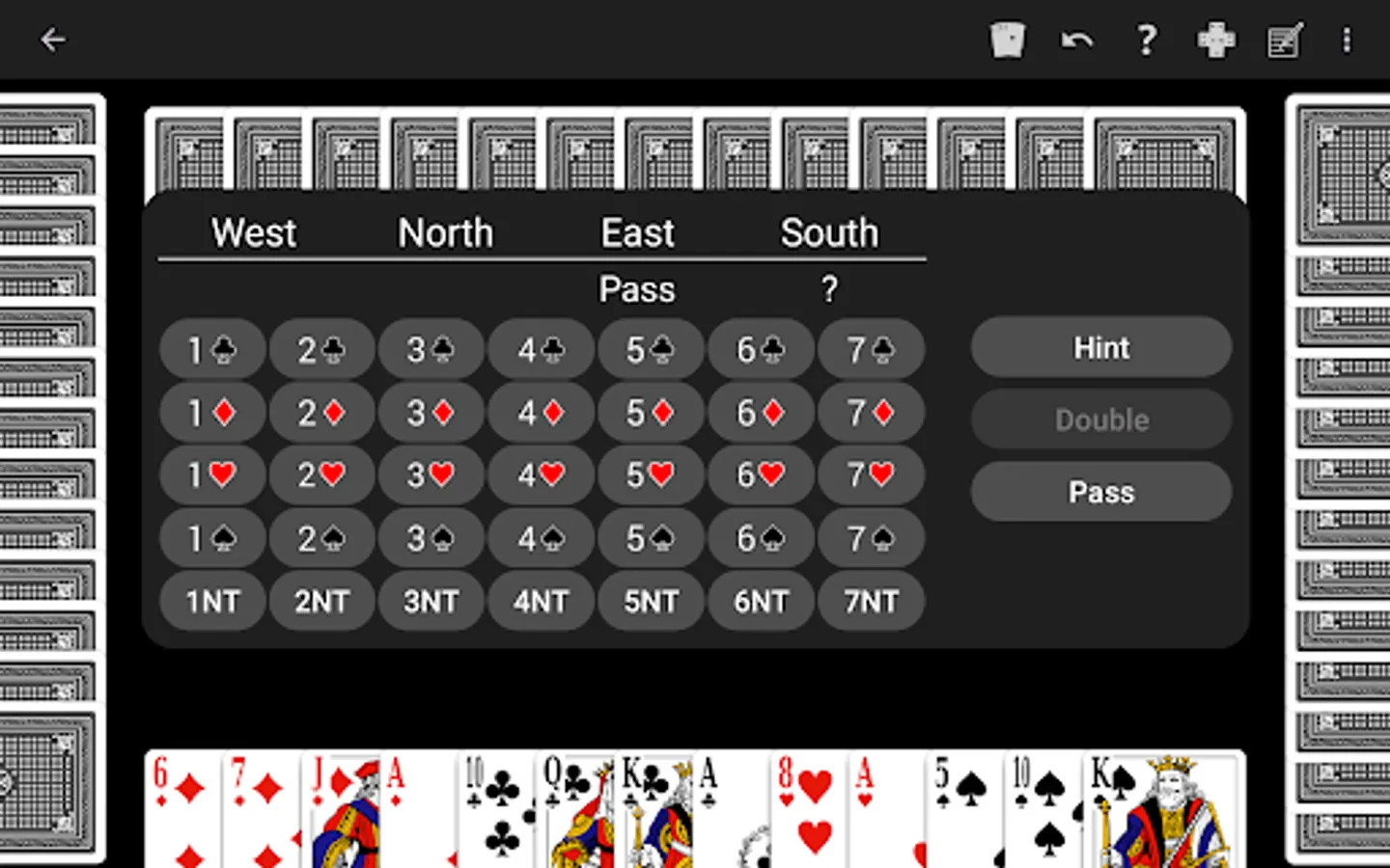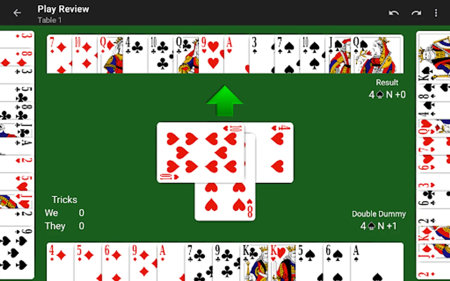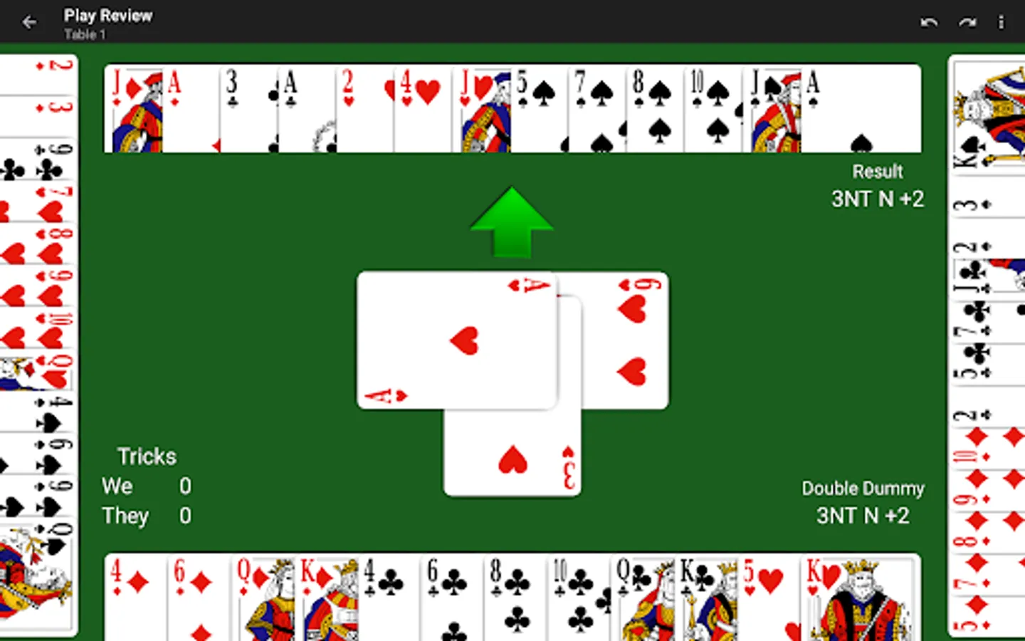 Our unique double dummy solver provides six levels of computer AI play. Not sure about the play of a hand? Step through an approximate double dummy solution.