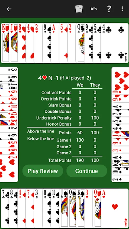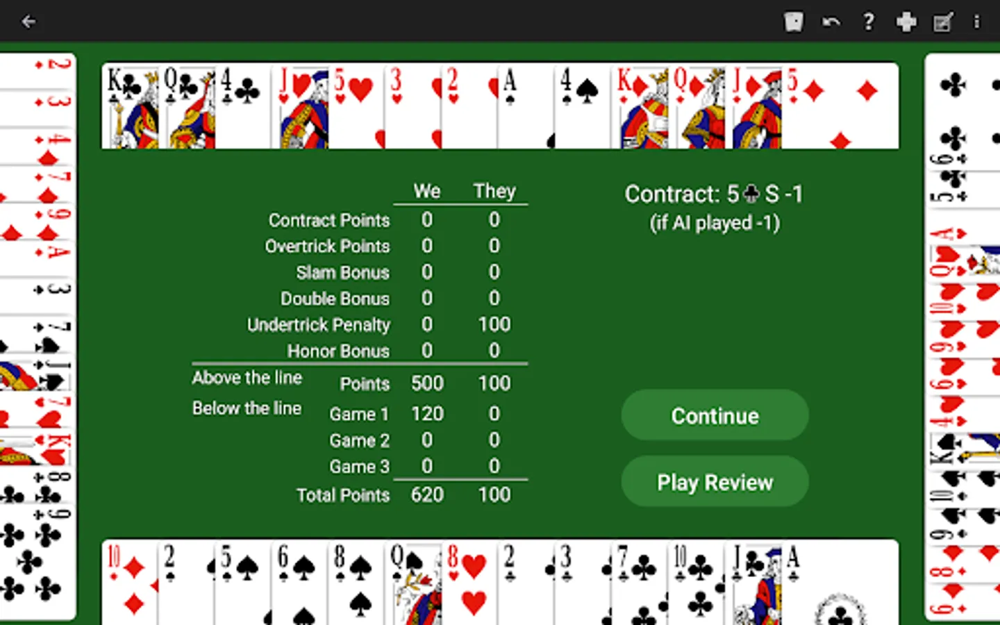 Detailed statistics are provided for you to further analyze your play and bidding. For example, see how many game or slam contracts you declare and make. Compare your statistics to the the AI's.