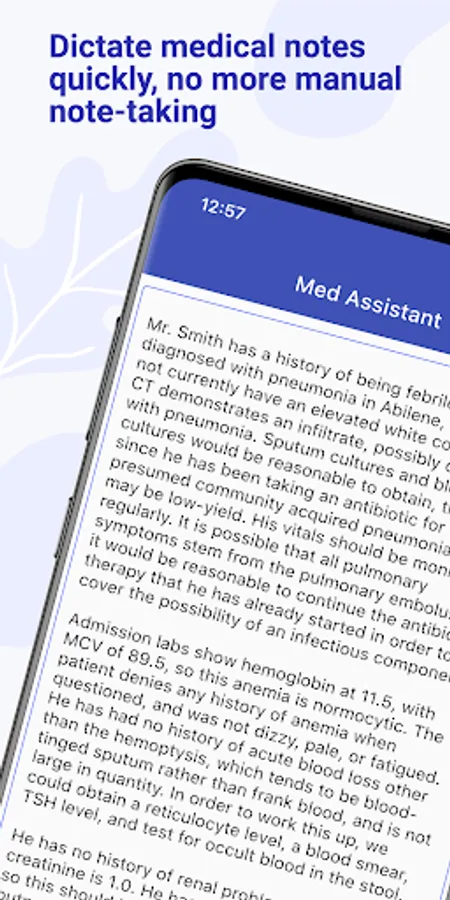 Using Med Assistant, physicians can dictate their notes simply using a phone or tablet. This gives physicians the ability to dictate medical notes quickly, instead of manual note-taking or waiting for third party services, reducing time and cost and improving the patient experience.
