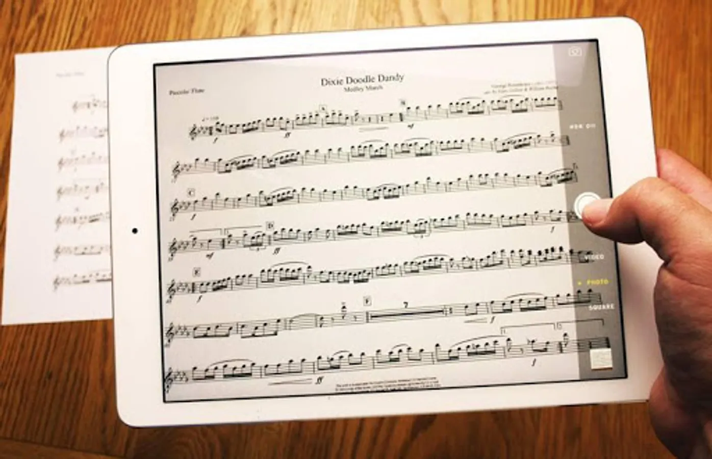 - Includes PhotoScore Now - A free 1-staff version of the PhotoScore Add-In (In-App Purchase) for full NotateMe. Take photos of printed sheet music with your device's camera, so you can play back and edit them with NotateMe Now! Recognizes 5-line staves and most markings including chords, flags, beams, rests, accidentals, articulation marks, clefs, key signatures, time signatures, tuplets, slurs, ties, hairpins and text including lyrics, dynamics and instrument names.