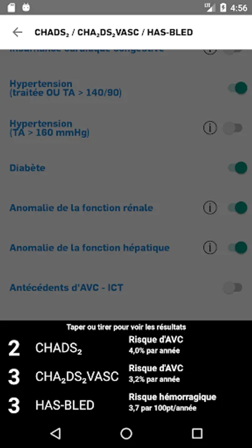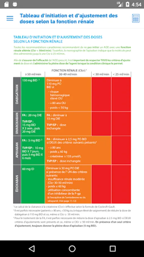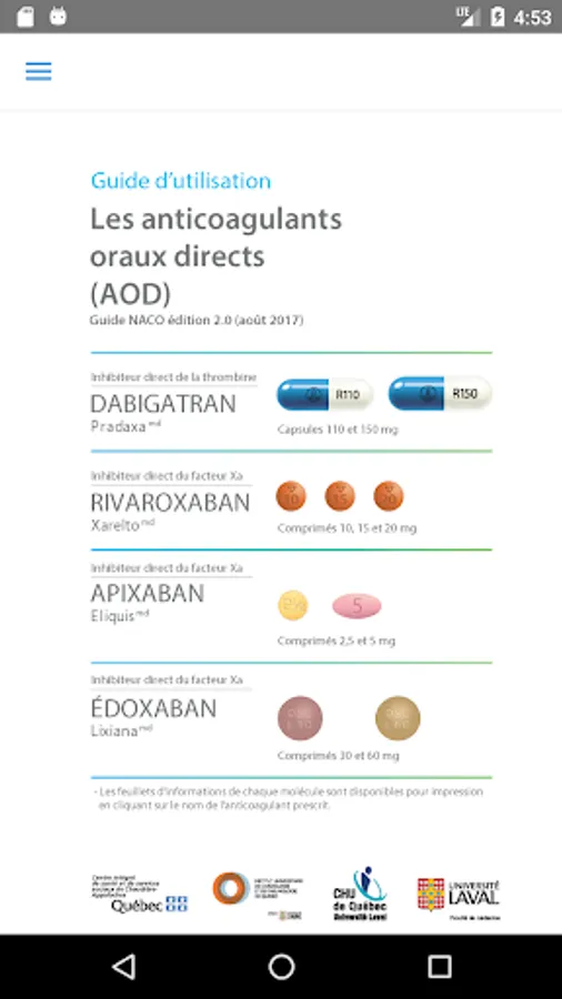 The direct oral anticoagulants User Guide was produced by health professionals (doctors, pharmacists (ne) s and nurses) working in the University Centers of the Quebec region. It is a practical reference book and easy to read for all professionals (general practitioners, specialists, pharmacists (ne) s and nurse (st) s) involved in monitoring patients for which direct oral anticoagulants (dabigatran ( Pradaxaᵐᵈ), rivaroxaban (Xareltoᵐᵈ), apixaban (Eliquisᵐᵈ) or edoxaban (Lixianaᵐᵈ)) was prescribed. The guide provided information on indications and criteria for reimbursement, dosages (including adjustment in renal failure), precautions and cons-indications, pharmacokinetics, interactions, management of peri and post-operative, the management of bleeding, as well as recommendations on the monitoring of patients. Useful calculators for calculating creatinine clearance and for risk scales CHADS₂, HAS-BLED CHA₂DS₂VASC and were incorporated to facilitate patient care.
