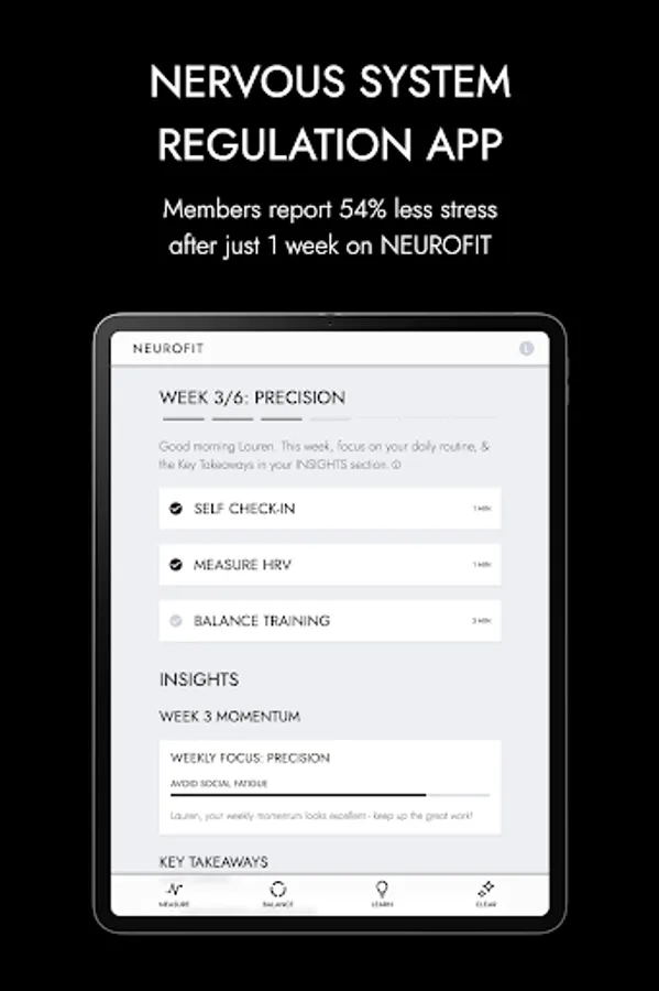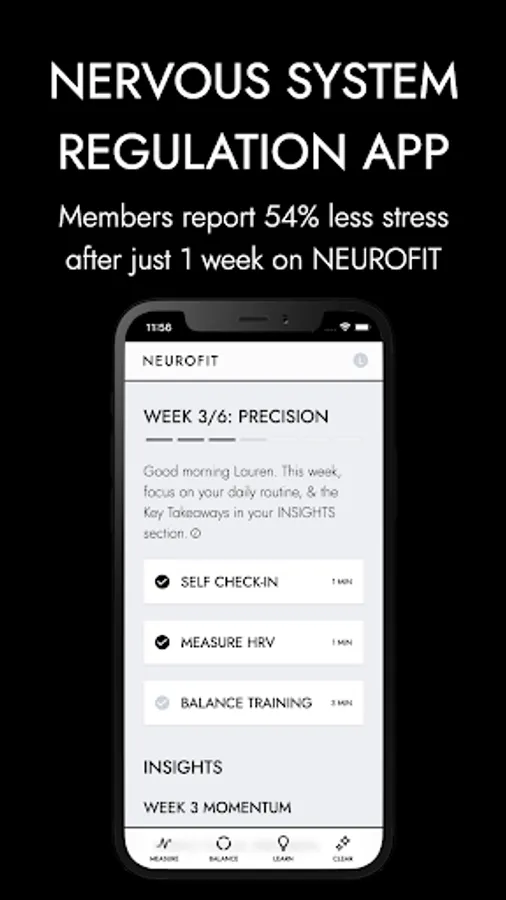 NEUROFIT™ is the world’s first Nervous System Trainer: helping you regulate, balance and optimize your nervous system from the bottom-up, with daily check-ins, biometric measurements, on-demand exercises and personalized insights.