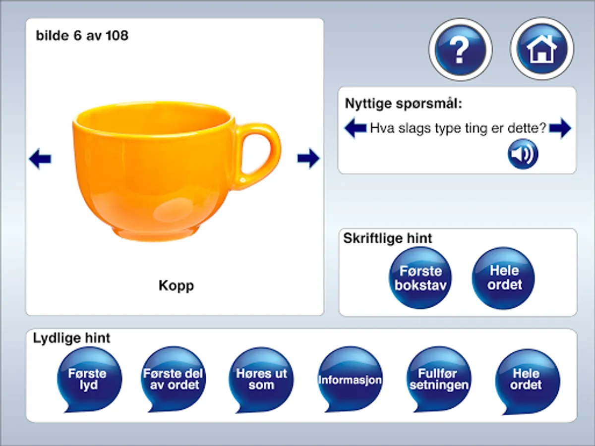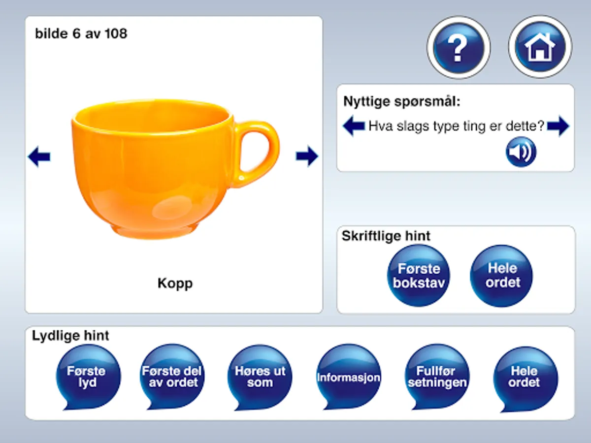 Daily life helps people with word retrieval of practicing word find and strategies ordmobilisering. The app is originally created by speech therapists. It is adapted Norwegian in collaboration with Aphasia Association in Norway, aphasia team at Statped southeast and ExtraFoundation. It is based on our award-winning app Talk Around It, which is available in English, Spanish, Hindi and Brazilian Portuguese.